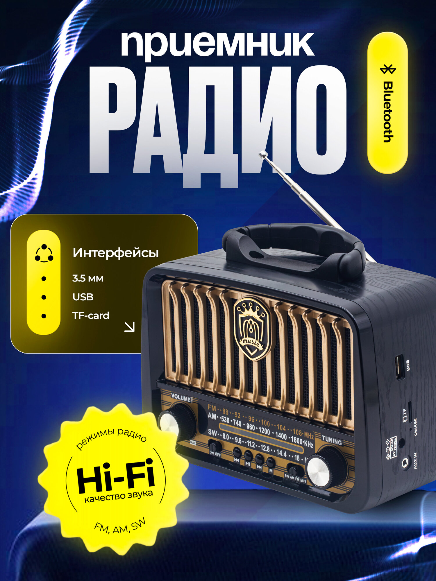 Радиоприемник в ретро стиле с подсветкой и bluetooth Raiseng R-3177BT черный информация: