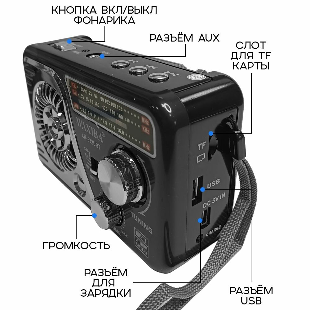 Радиоприемник цифровой портативный с фонариком Waxiba XB-522URT радио колонка, цвет - черный информация: