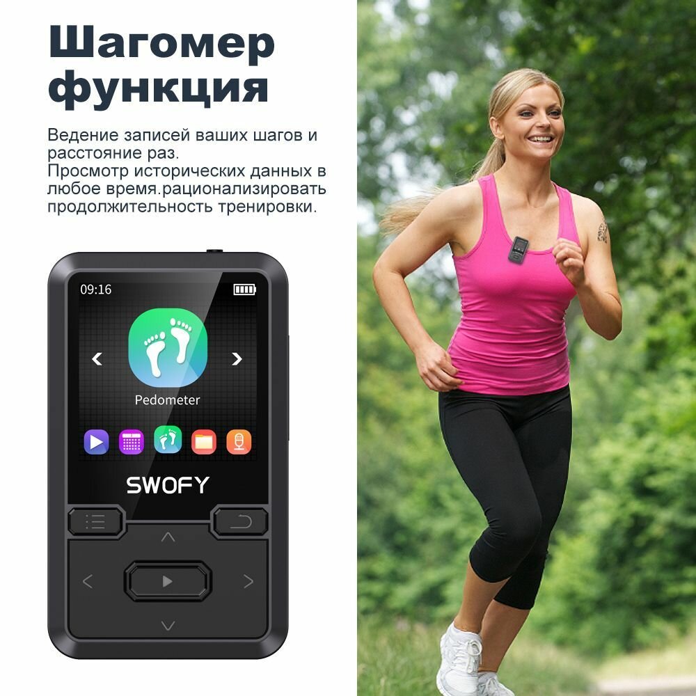 Отзывы на Мини портативный носимый MP3 плеер SWOFY-M10/Bluetooth 5.0/FM/шагомер/макс 128 Гб (черный)