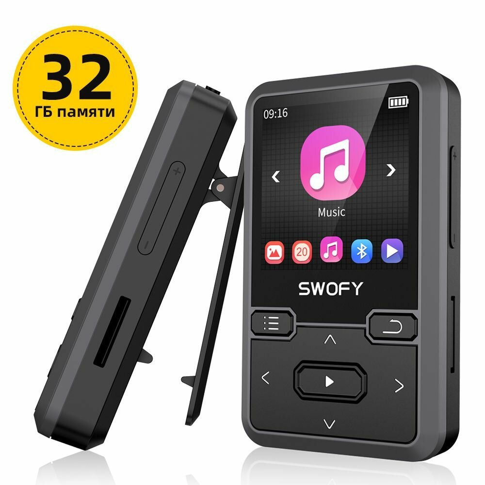 Мини портативный носимый MP3 плеер SWOFY-M10/Bluetooth 5.0/FM/шагомер/макс 128 Гб (черный) информация: