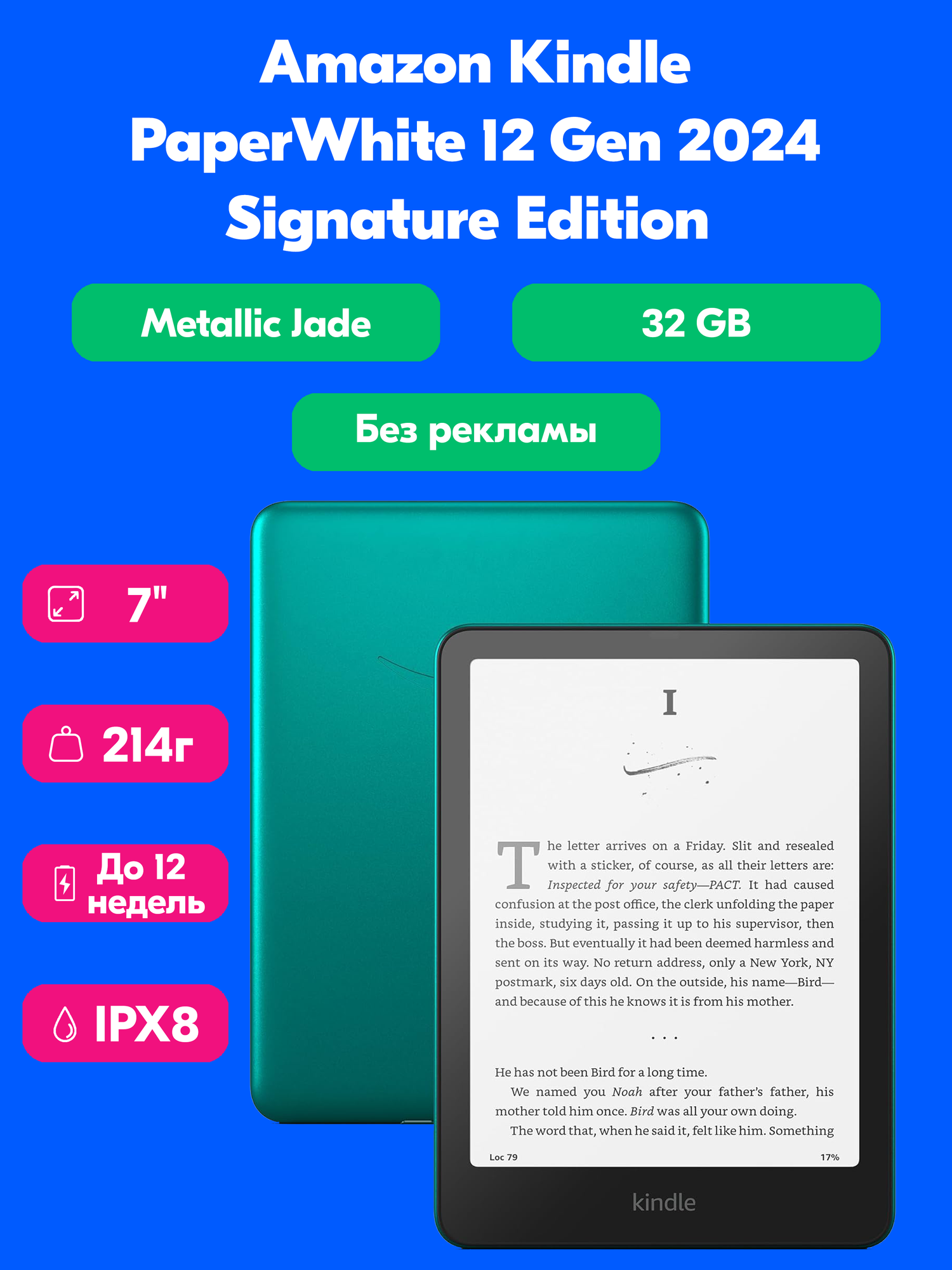 10 цен на 7” Amazon Kindle PaperWhite 2024 (12th Gen) 32Gb Signature Edition (Metallic Jade) без рекламы Электронная книга, E-ink