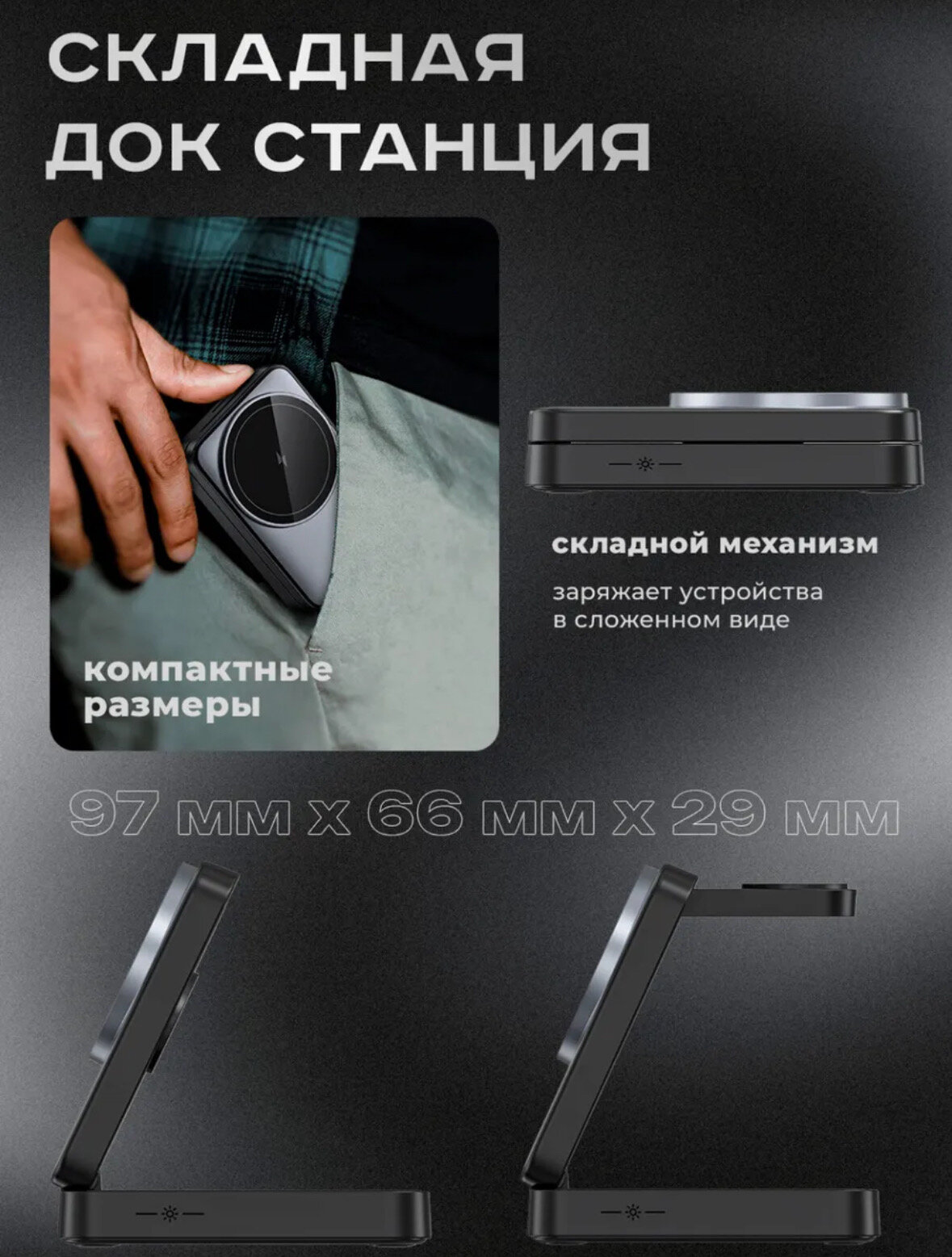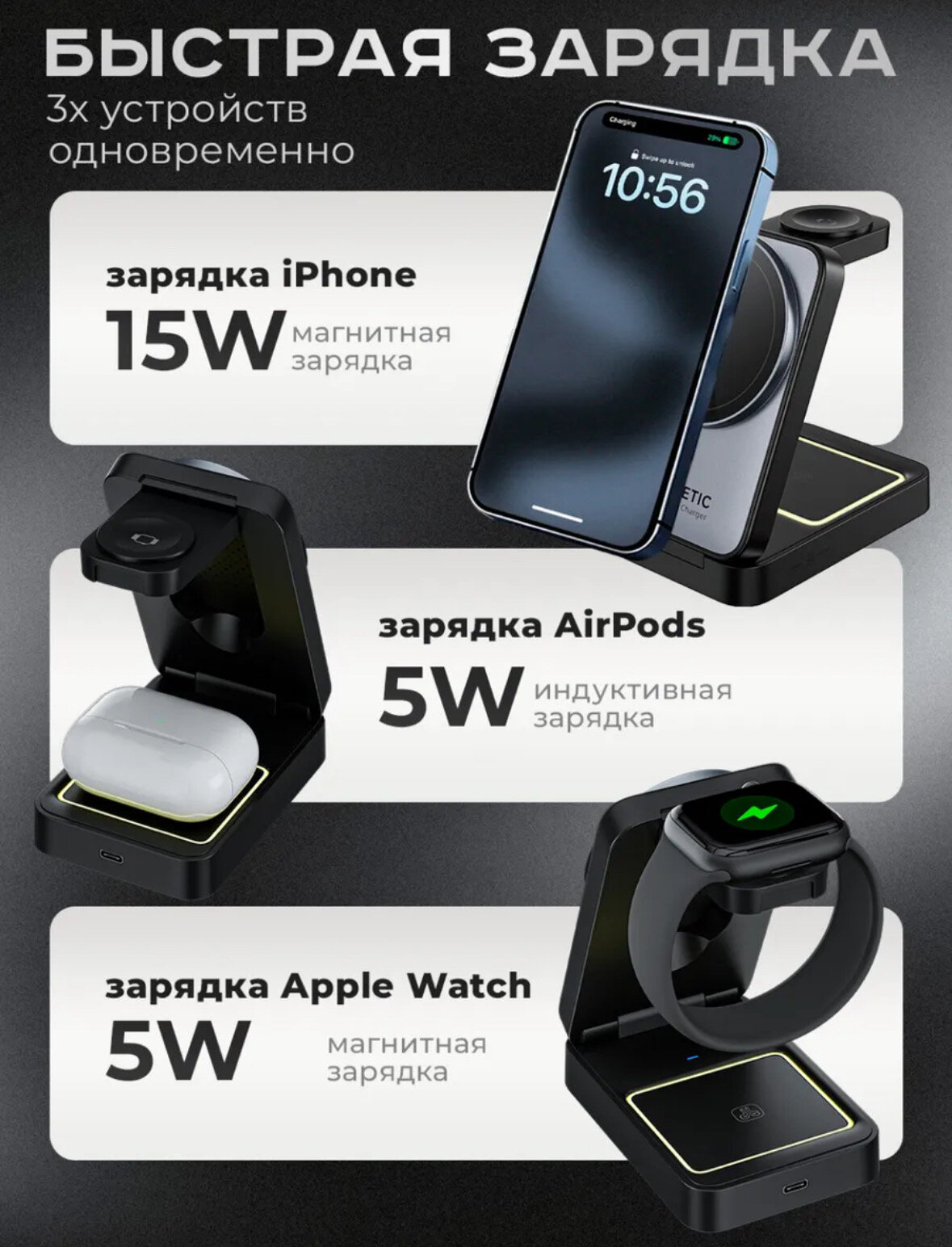 Беспроводная зарядка для iphone android, зарядная станция 3 в 1 для AirPods, Apple Watch, док станция для айфон magsafe информация: