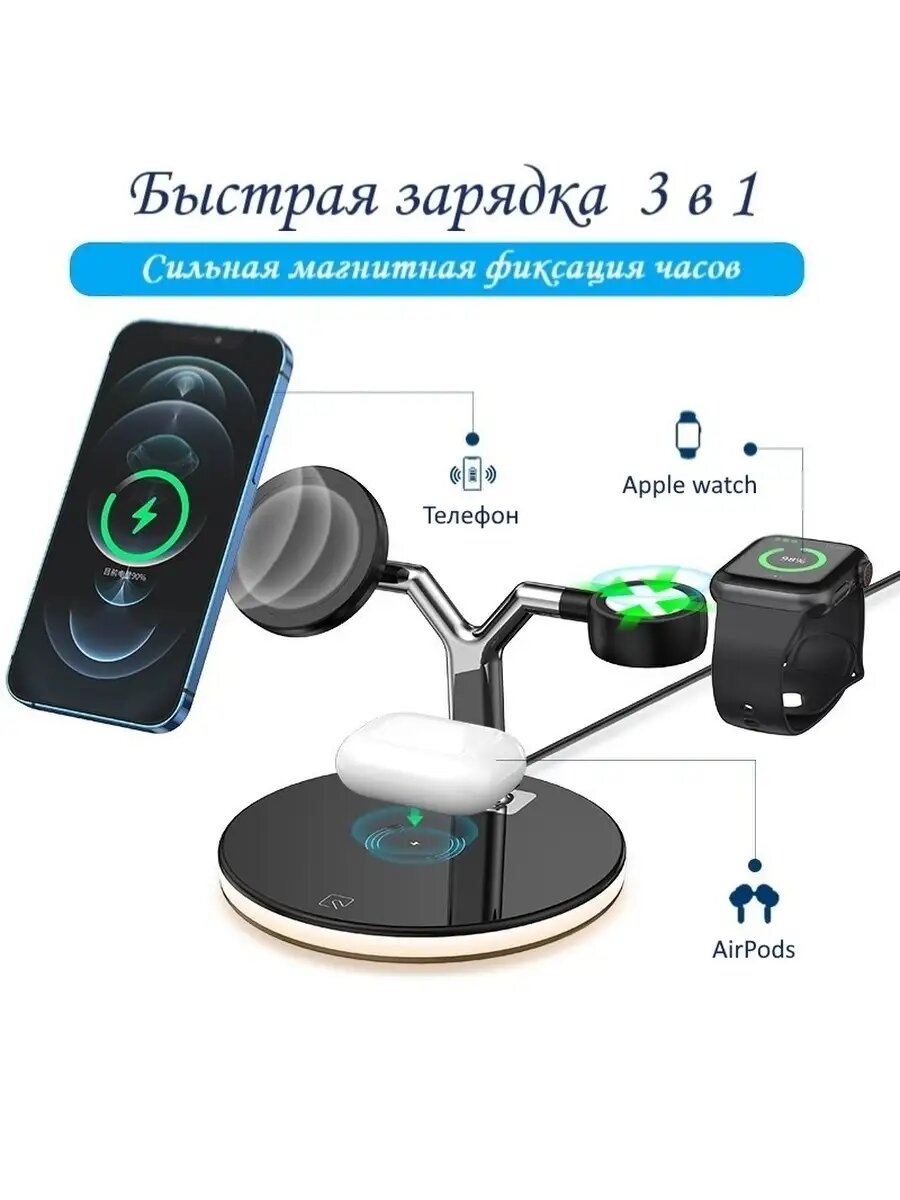Док-станция 3-в-1 Беспроводная быстрая зарядка для iPhone, часов и наушников информация: