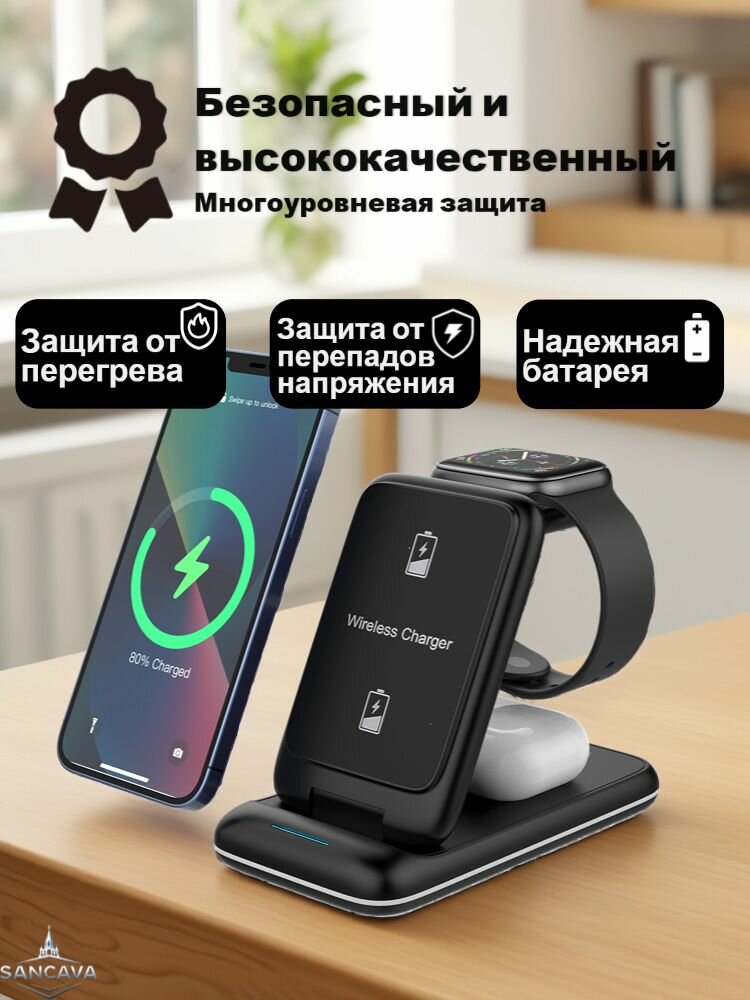 Беспроводная зарядка для Android и iphone/Зарядная станция для Android и Apple/Док станция 3 в 1/черное 3 299 ₽