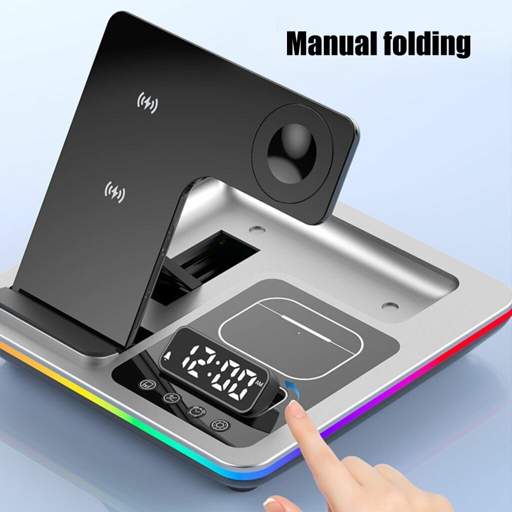 Часы с цифровым дисплеем и беспроводным зарядным устройством "пять в одном" с красочной подсветкой RGB-черный информация:
