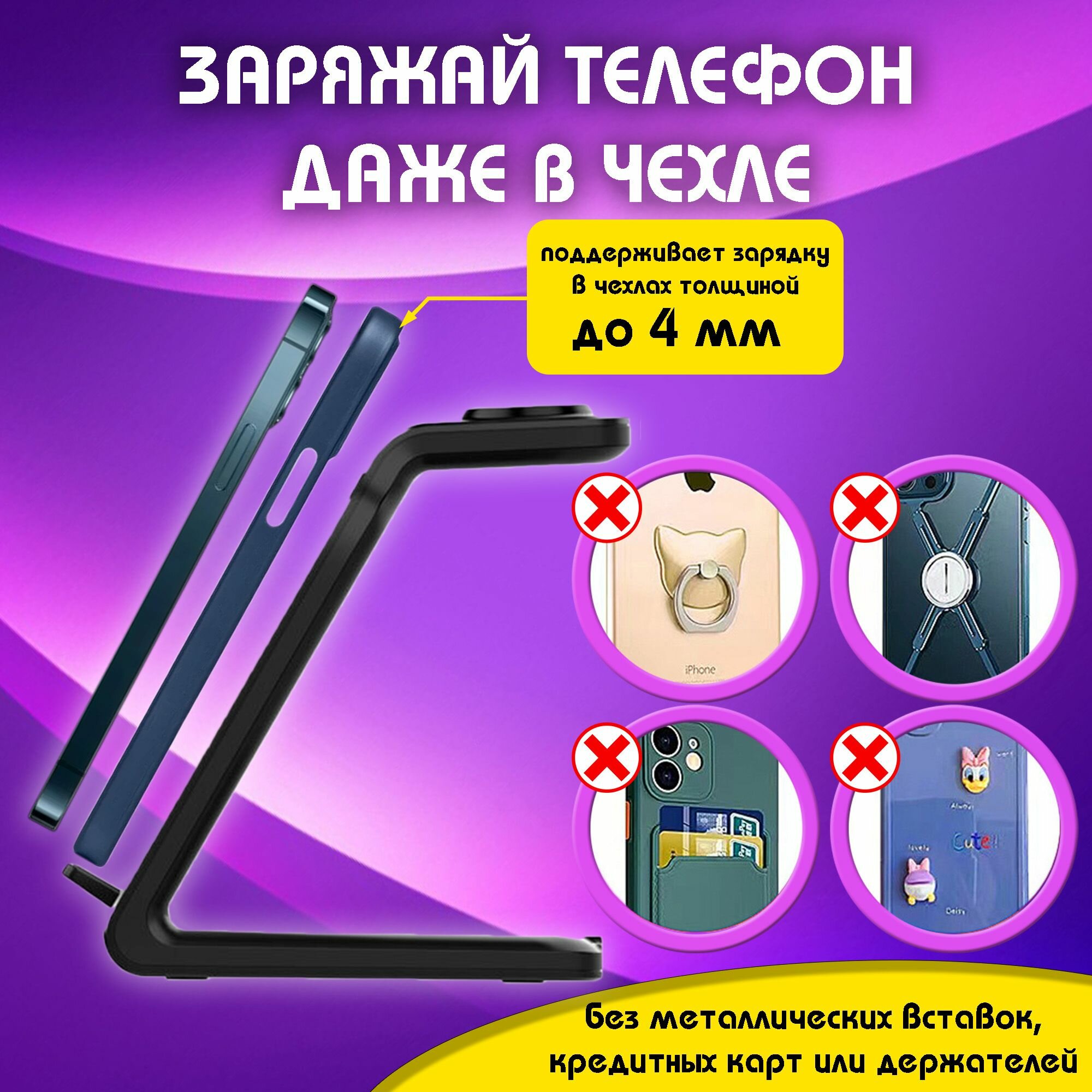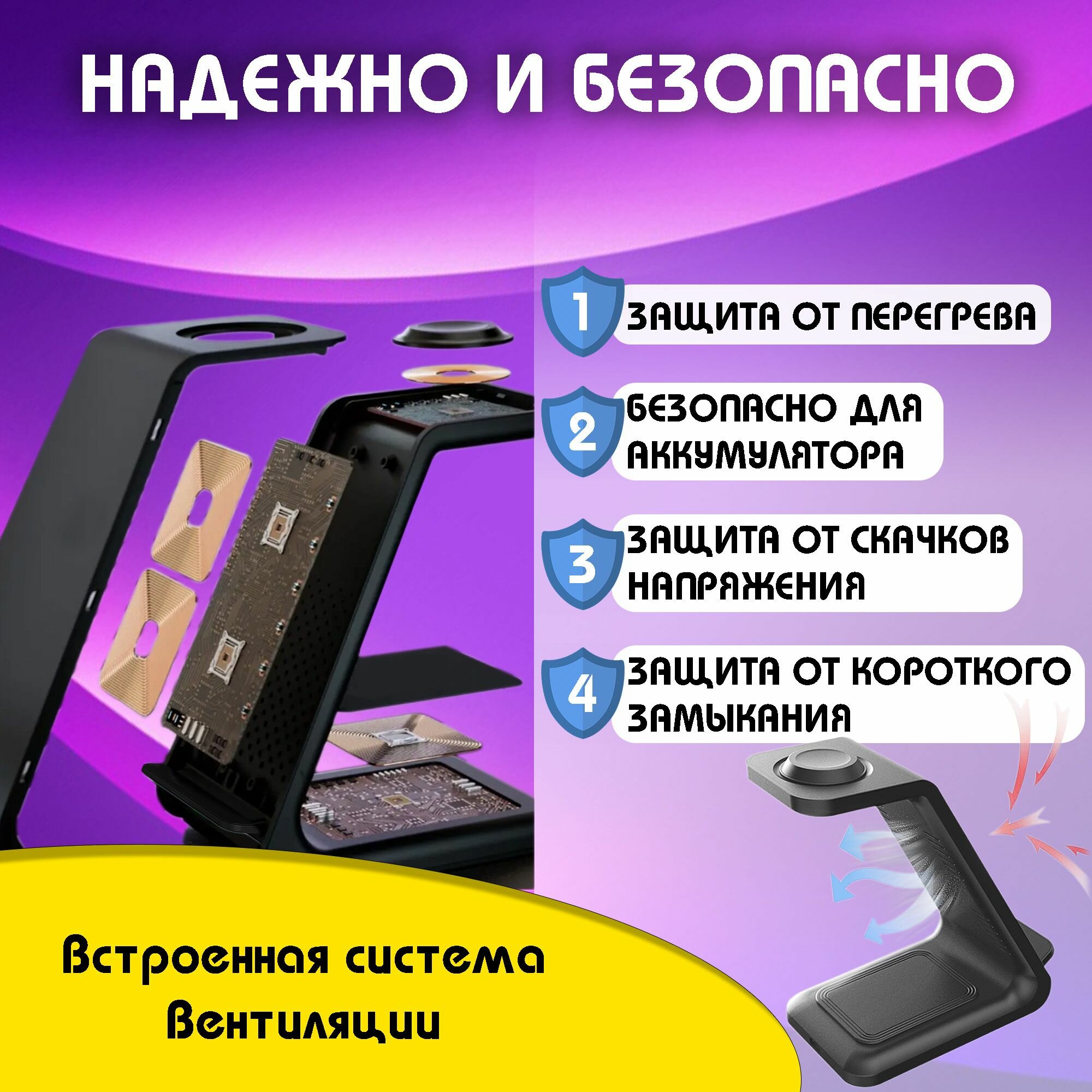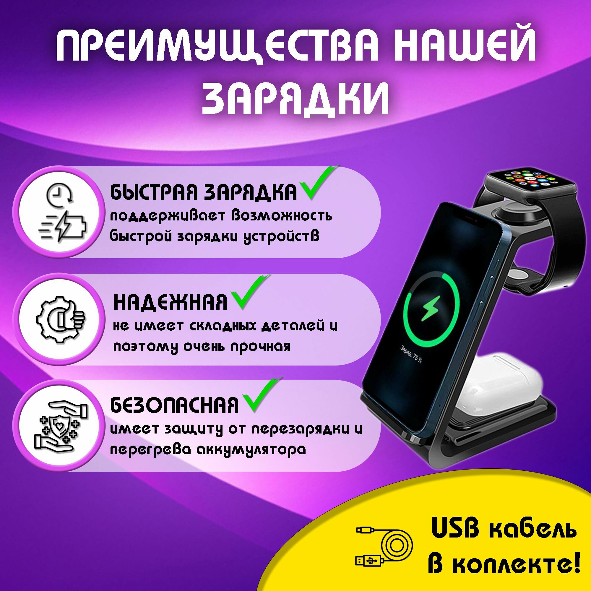 Беспроводная зарядка 3 в 1 / Док станция мощностью 15W с функцией быстрой зарядки Apple Iphone, Samsung, Xiaomi, часов Apple Watch и наушников AirPods / черная информация: