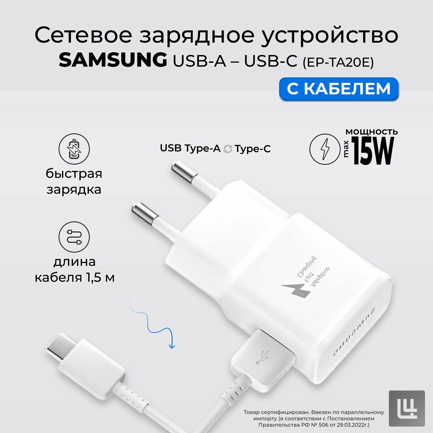 Сетевое зарядное устройство с кабелем Samsung USB-A To USB-C, 15В, (EP-TA20E) Быстрая зарядка, белый информация: