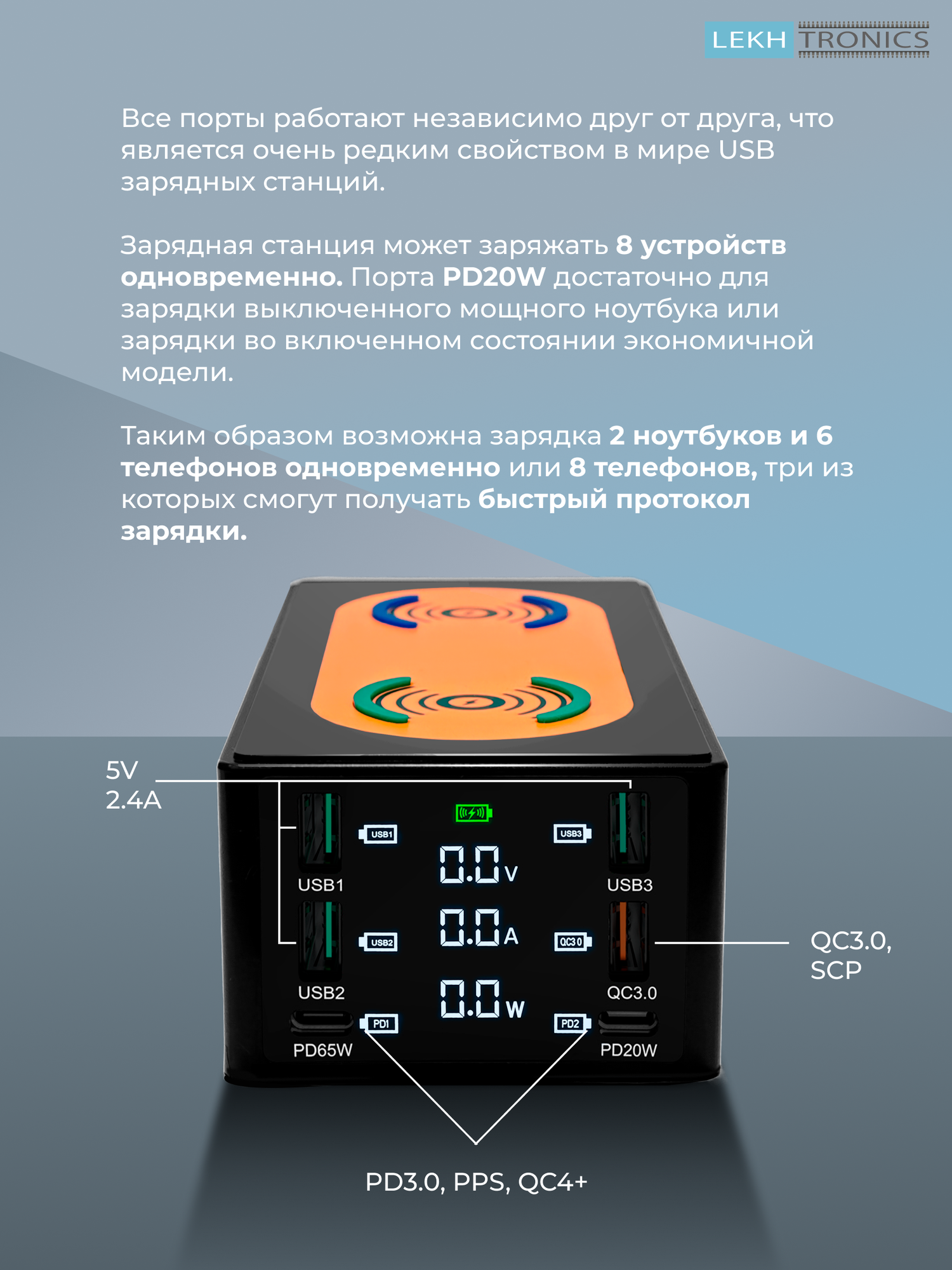 Зарядная станция USB - 6 портов + 2 беспроводные зарядки, подходит для PD ноутбуков, общая мощность 150W информация:
