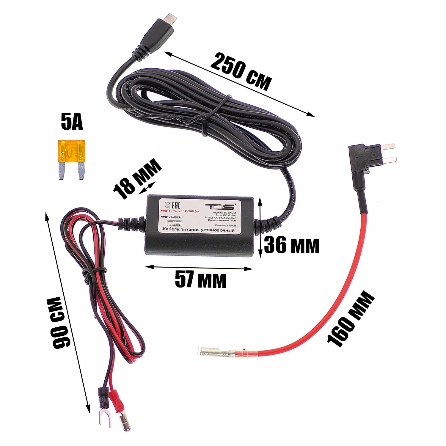 Скрытая проводка для видеорегистраторов, установочный кабель питания miniUSB TDS TS-CAU65 2.5 метра информация: