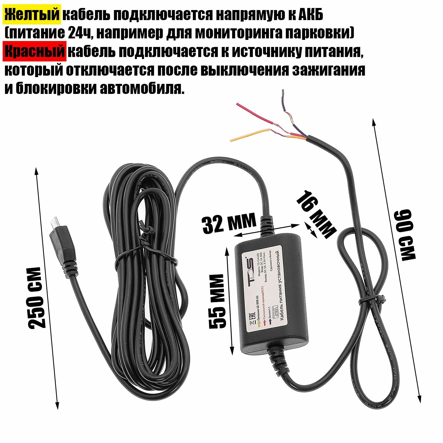 Скрытая проводка для видеорегистраторов, установочный кабель питания microUSB TDS TS-CAU66 2.5 метра информация: