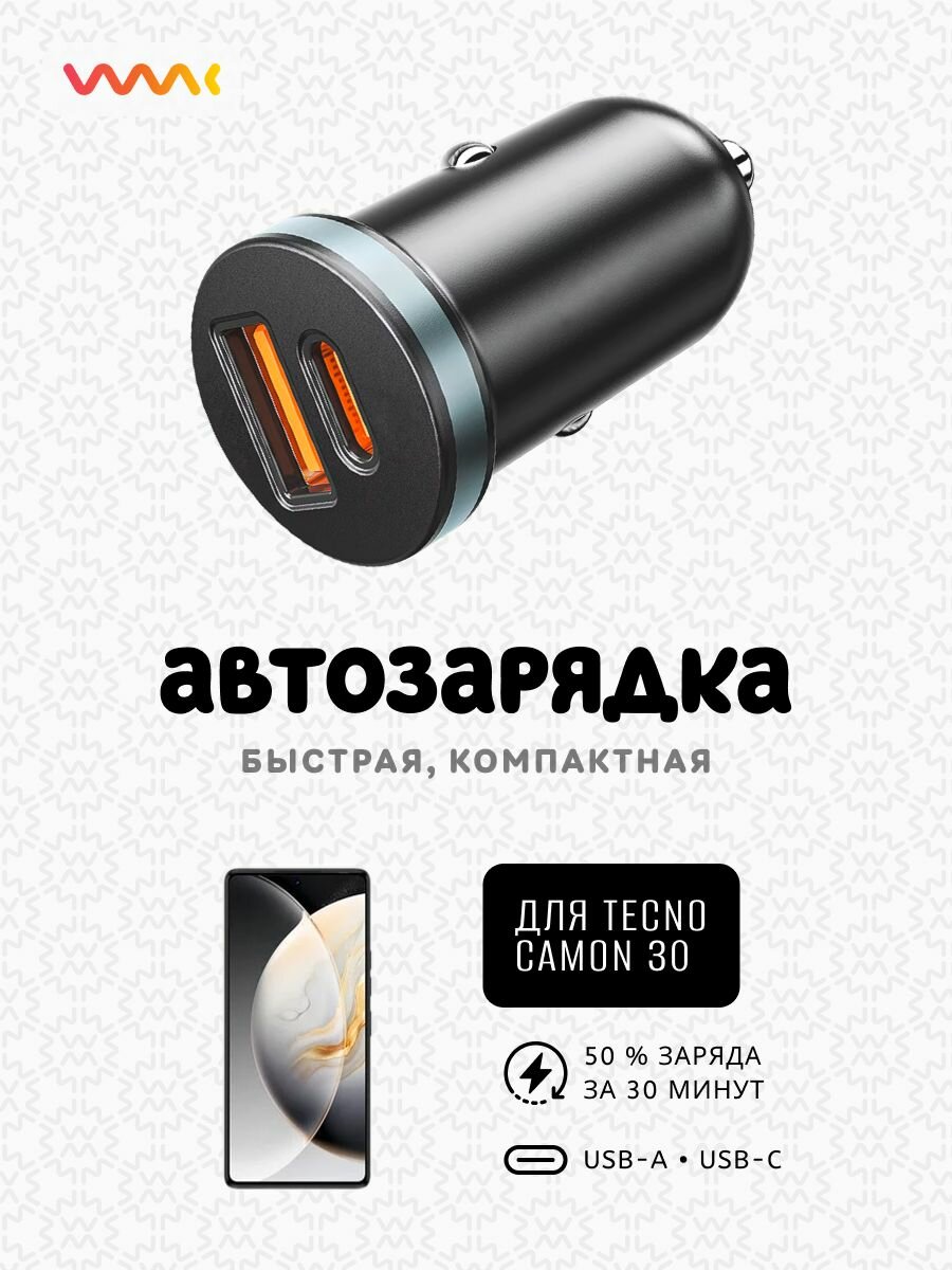 Быстрая автомобильная зарядка в прикуриватель для телефона Tecno Camon 30 (кабель в комплекте) информация: