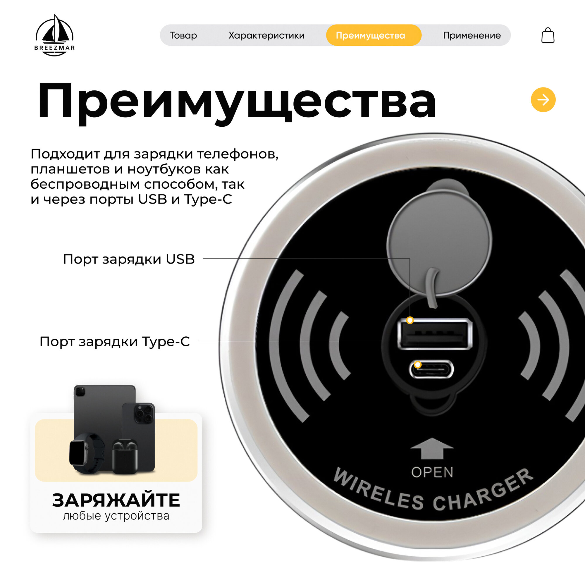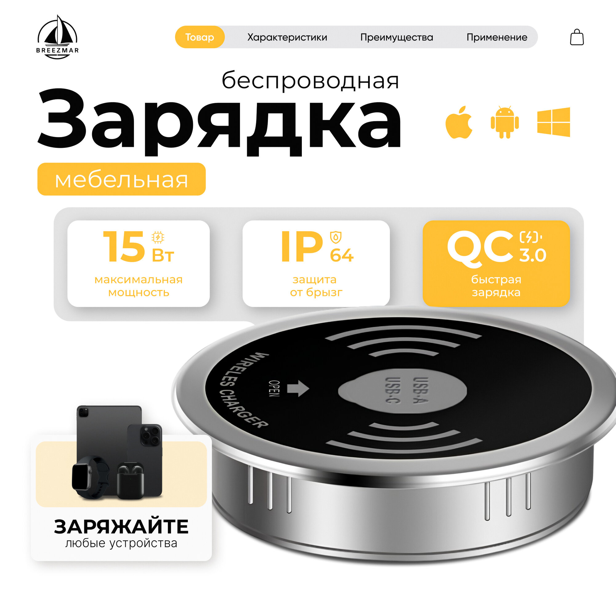 Беспроводная зарядка мебельная с быстрой зарядкой 15W для телефонов Android, iPhone, наушников и планшетов информация: