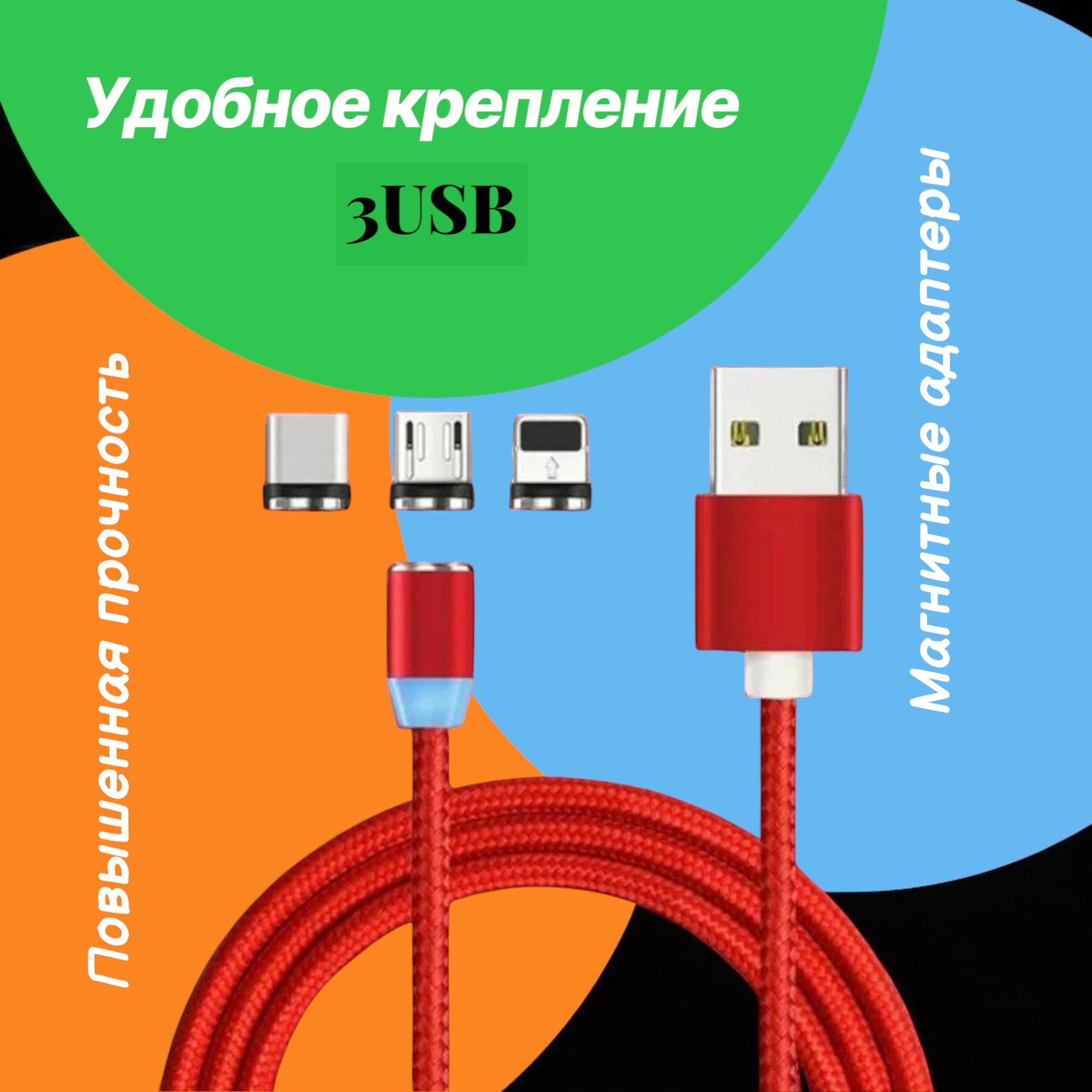 Отзывы на Магнитный зарядный кабель, USB Type-C/Lightning/MicroUSB, съемный коннектор, 1м, красный