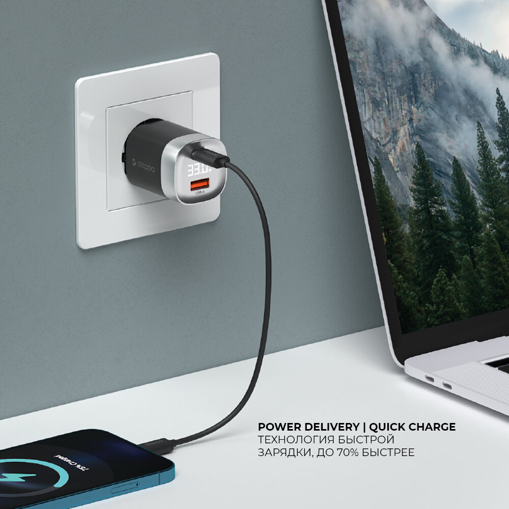 Сетевое зарядное устройство Wall Charger USB-C + USB A, PD 3.0, QC 3.0, 33W, дисплей, черный, Deppa, Deppa 11439 информация: