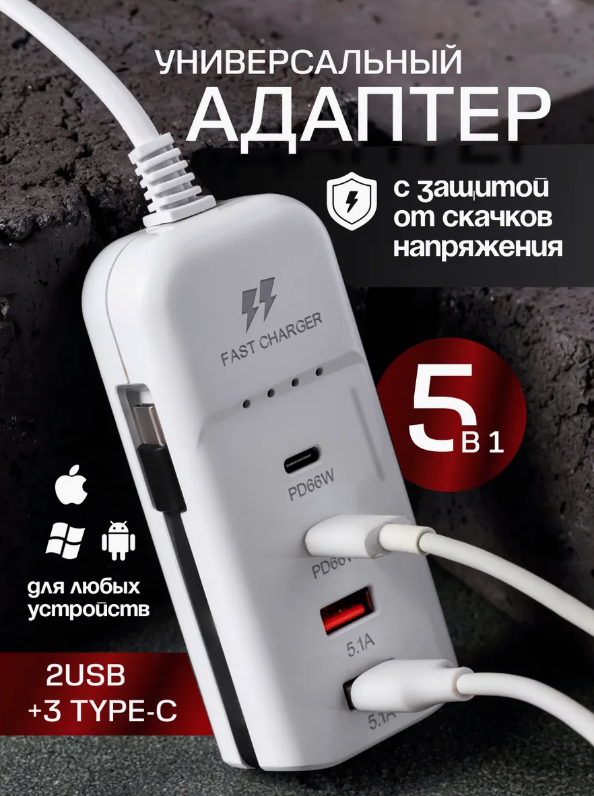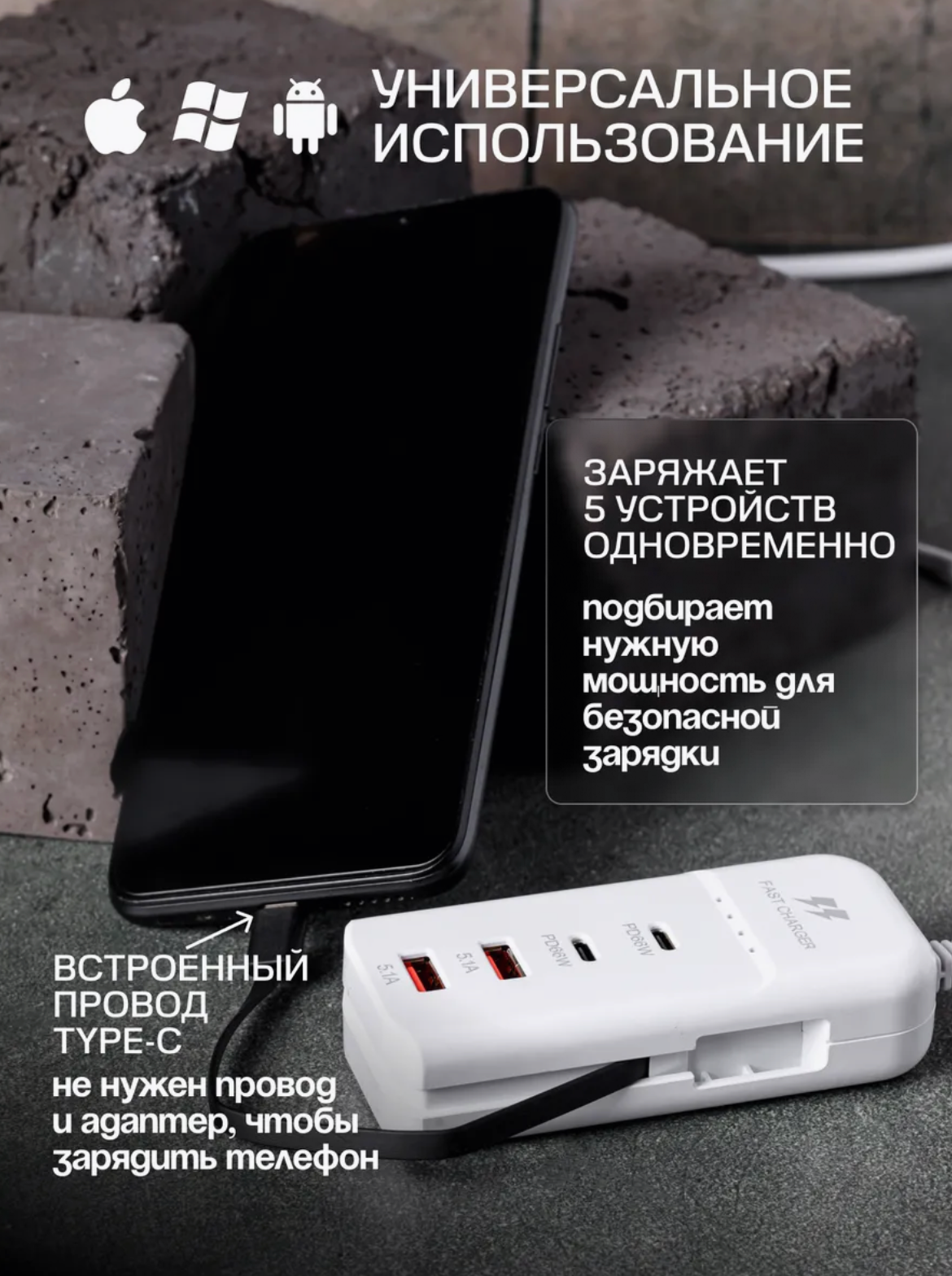 Отзывы на Зарядный блок Ancloth, USB + Type-C, 4 разъема, длина кабеля 1 м