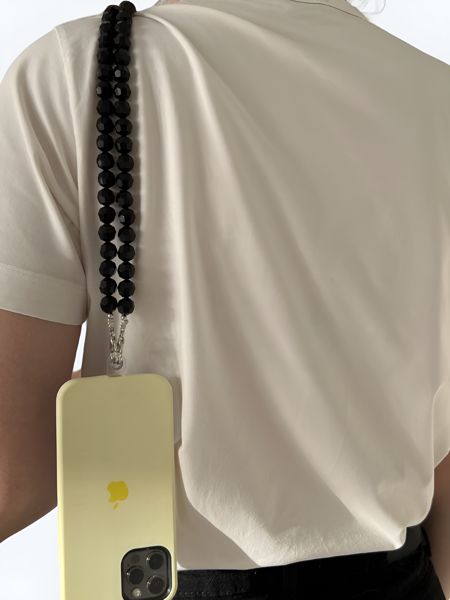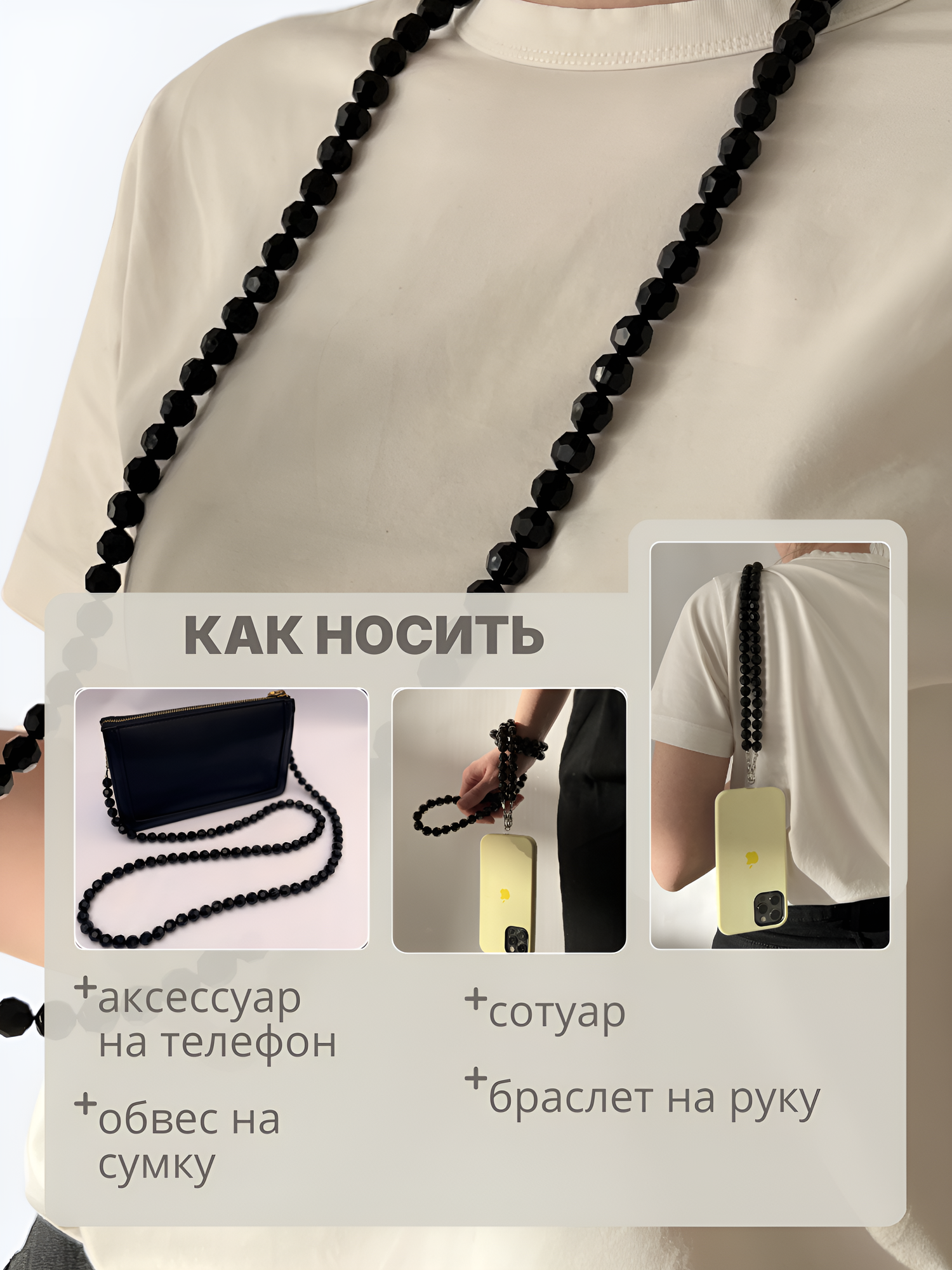 Шнурок подвеска для телефона с черными бусинами и вкладышем для чехла информация: