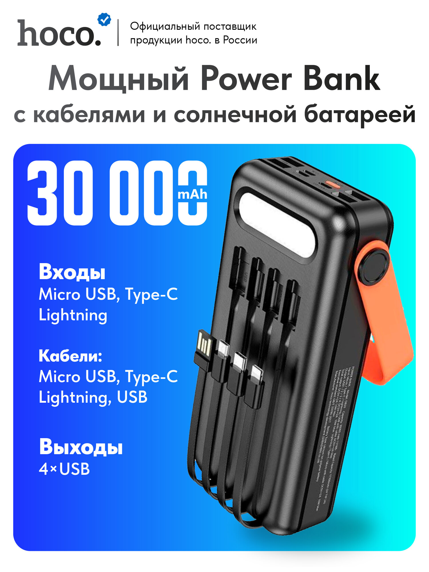 10 цен на Внешний аккумулятор повербанк Hoco DB33 (с кабелями Micro USB, Type-C Lightning, USB) на солнечной батарее. 30000 mAh