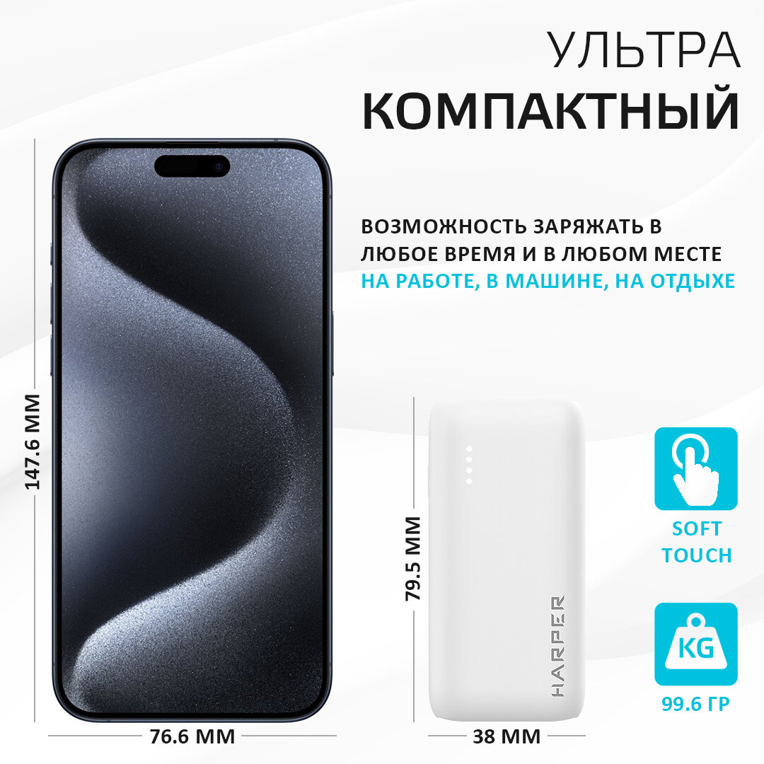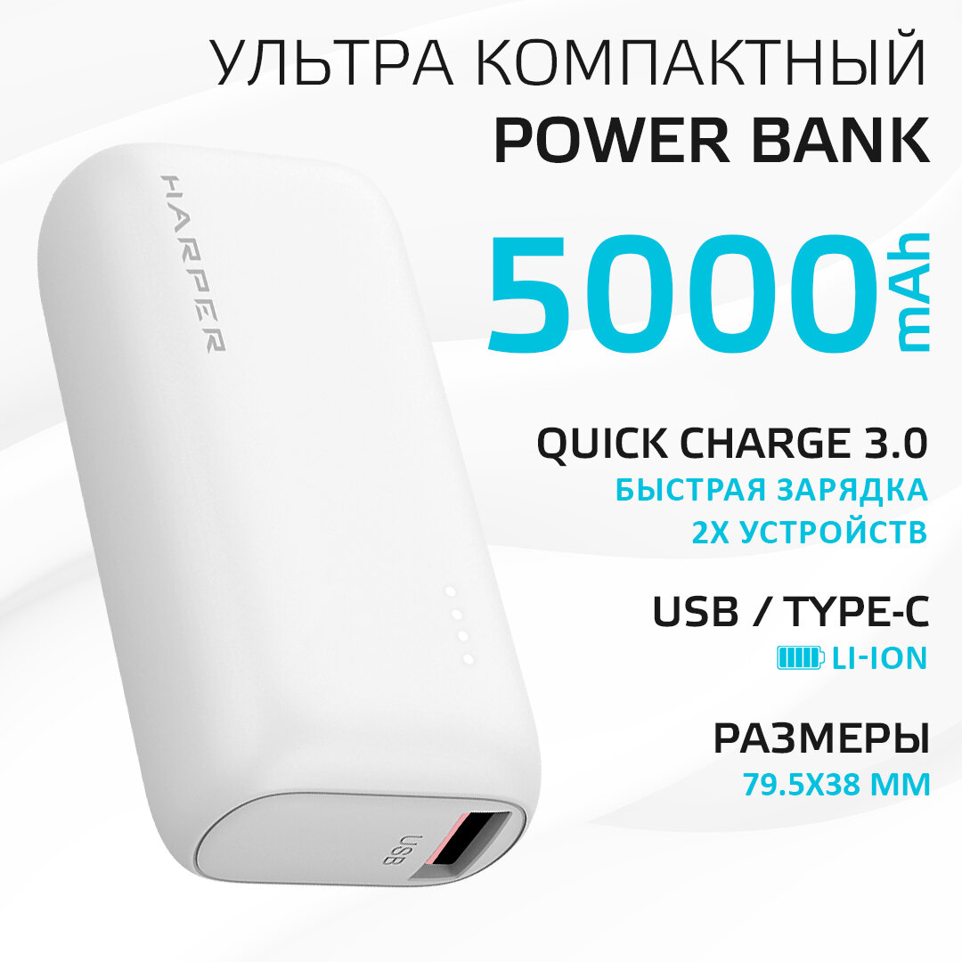 Повербанк / Внешний аккумулятор для телефона 5 000 мАч / Type-C и USB, Harper PB-2606, белый информация: