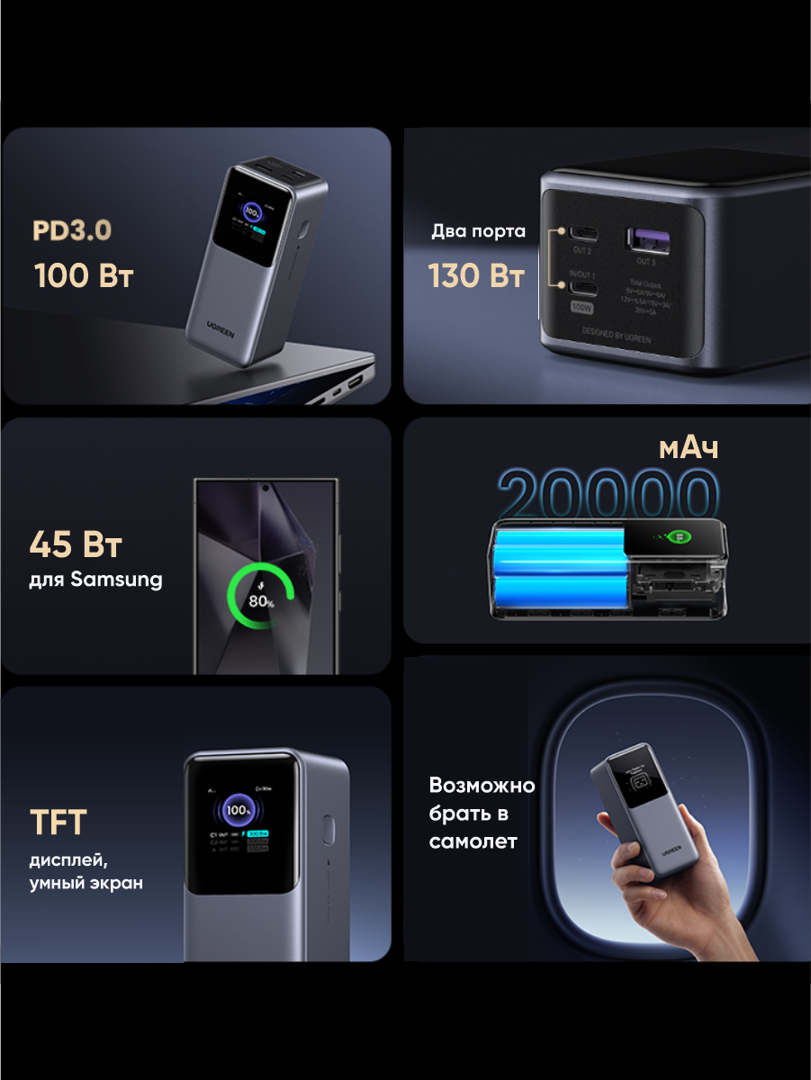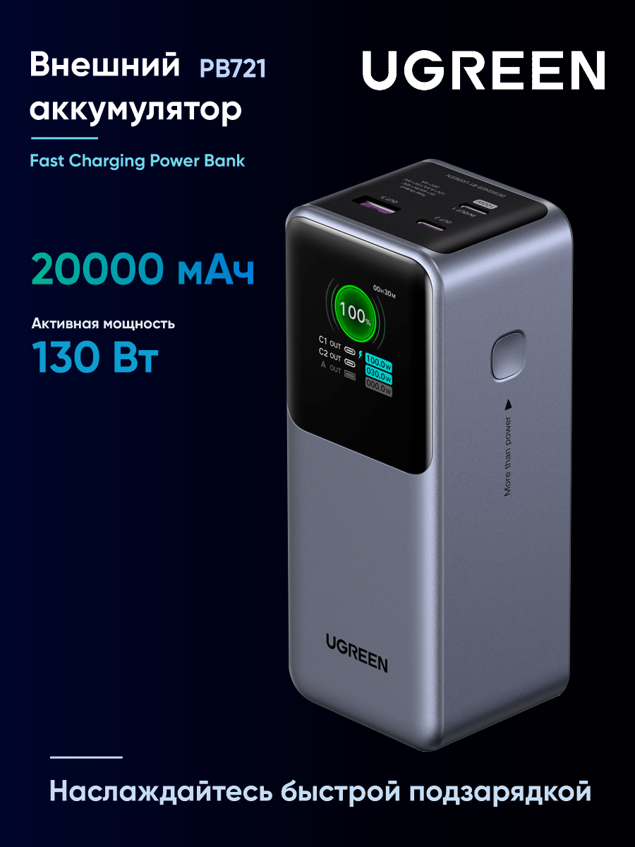 Отзывы на Внешний аккумулятор UGREEN PB721 (35524B) 20000mAh 130W Fast Charging Power Bank. Цвет: серый