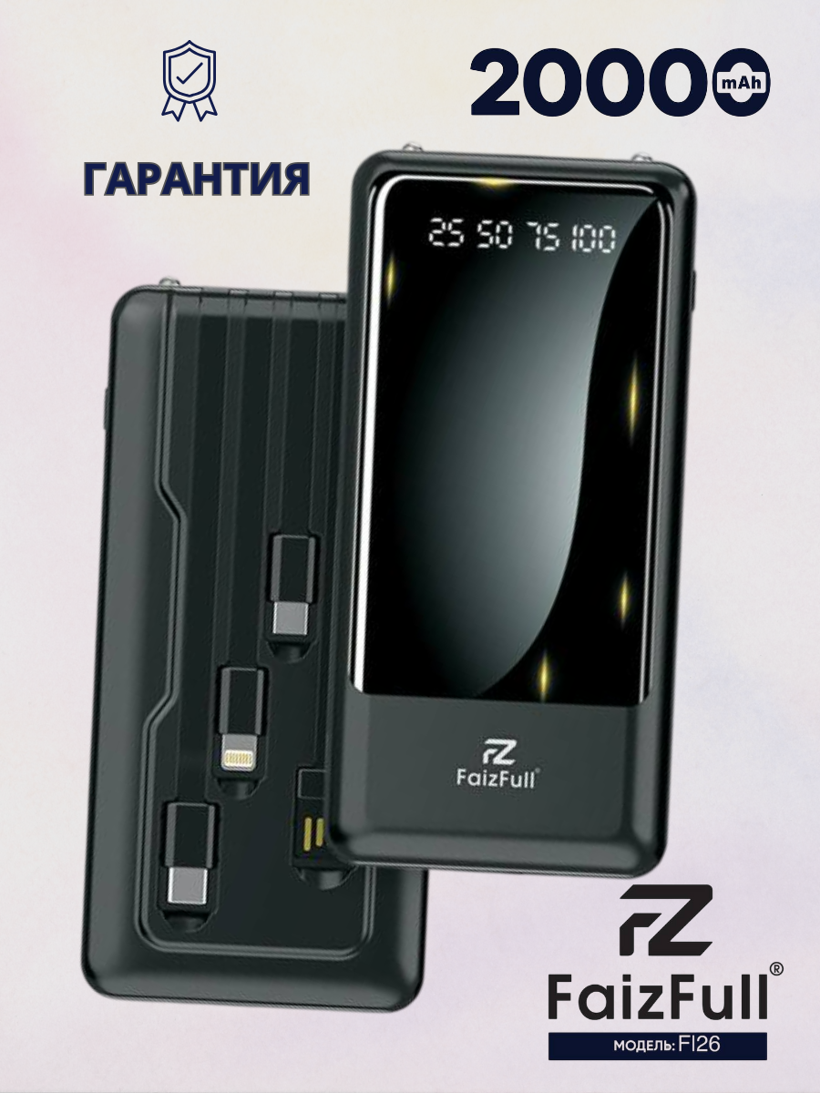 10 цен на Power Bank, FaizFull, FL26, 20000 mah, Повербанк, встроенные провода, фонарик, черный
