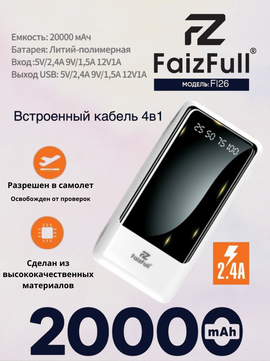 Отзывы на Power Bank, FaizFull, FL26, 20000 mah, Повербанк, встроенные провода, фонарик, белый