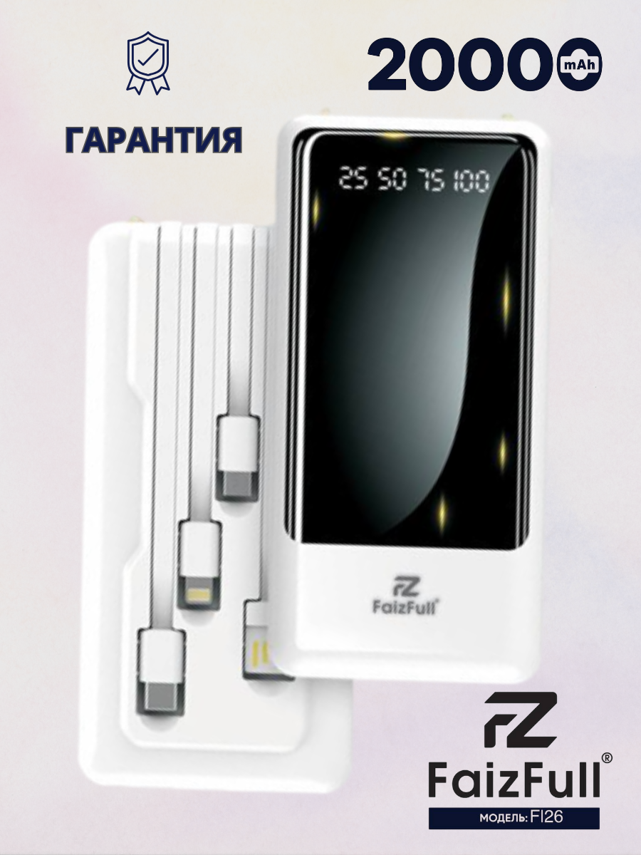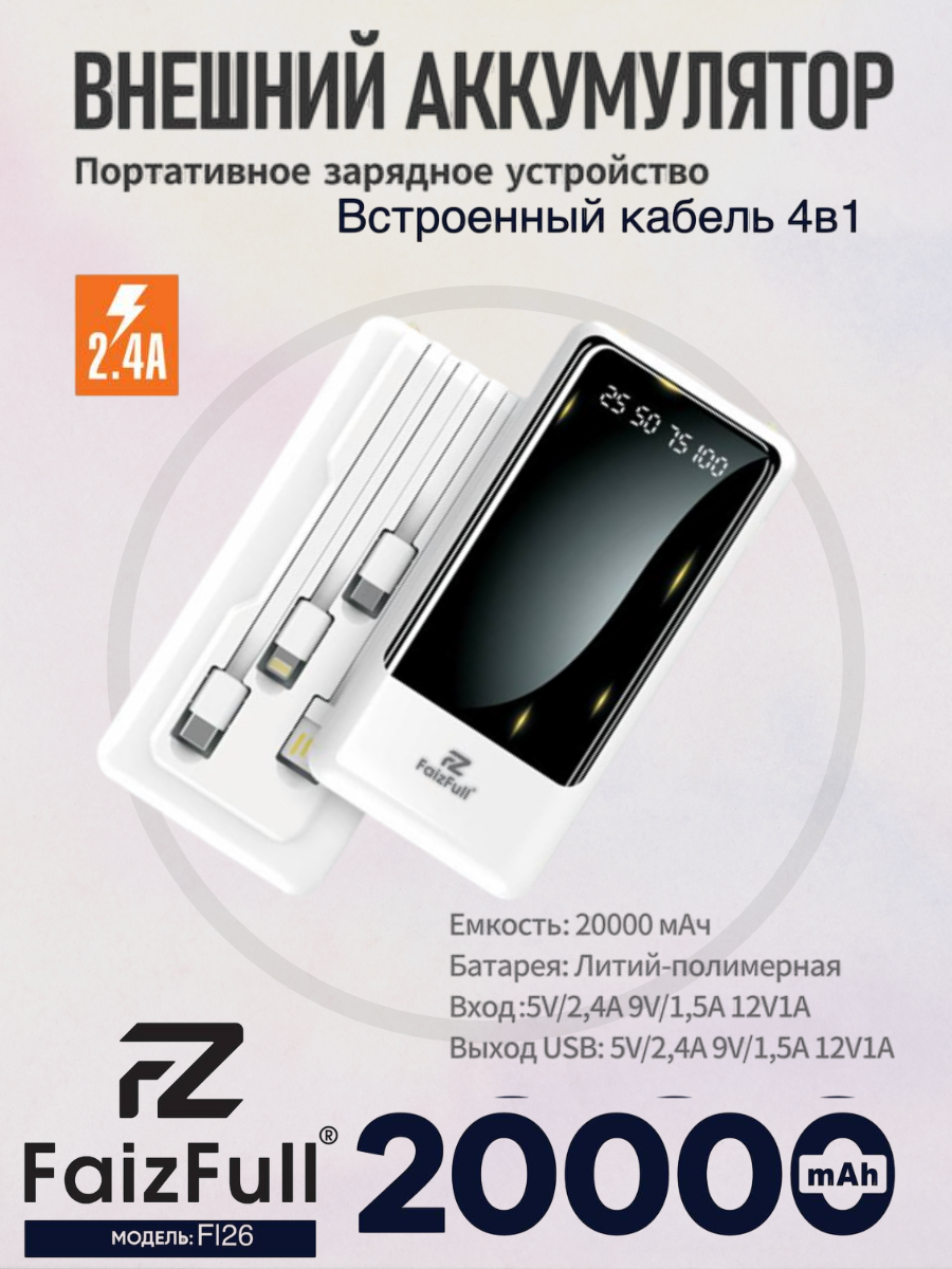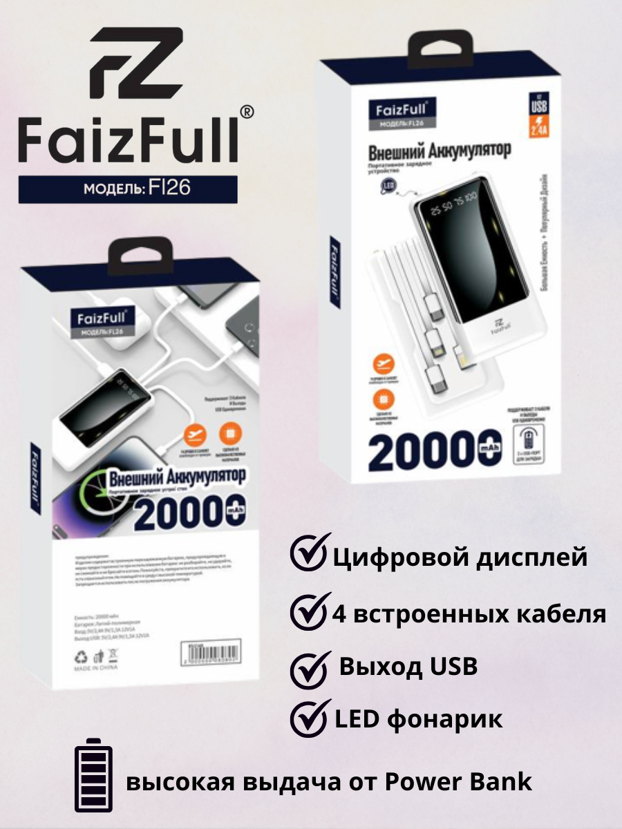 10 цен на Power Bank, FaizFull, FL26, 20000 mah, Повербанк, встроенные провода, фонарик, белый