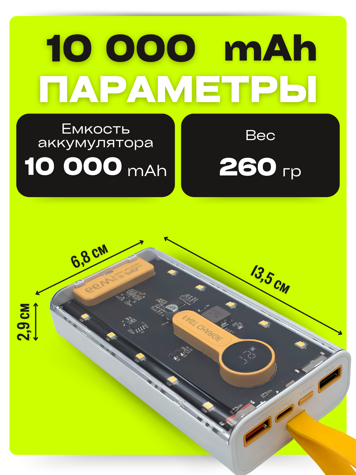 Отзывы на Повербанк, Power Bank yellow 10000mah с быстрой зарядкой, встроенными кабелями, внешний аккумулятор