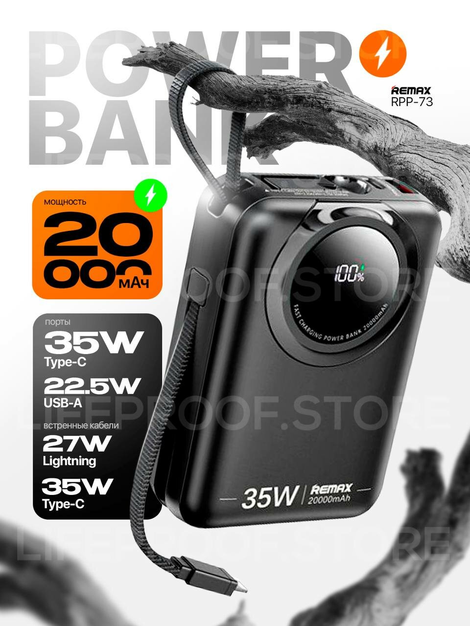 Отзывы на Повербанк / внешний аккумулятор Remax RPP-73 35W 20000mAh со встроенными кабелями Type-C и Lightning, цвет Черный