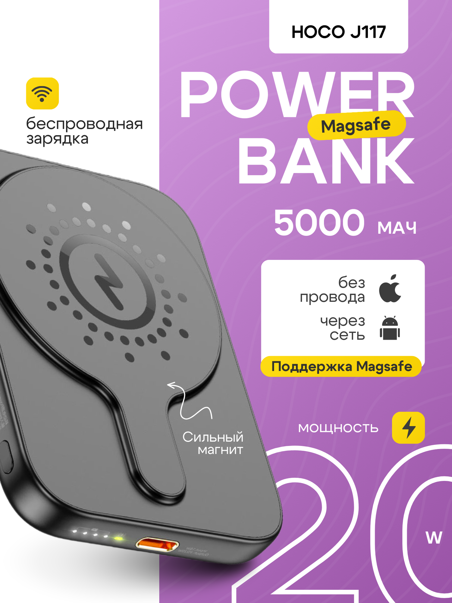 Отзывы на Внешний аккумулятор Hoco J117, 5000mAh, MagSafe, быстрая зарядка