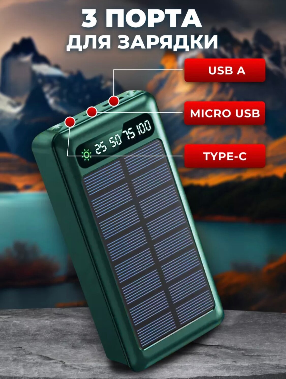 Внешний аккумулятор, 50000mAh, с фонариком, влагозащищенный, с солнечной батареей,зарядка 3 устройств сразу информация: