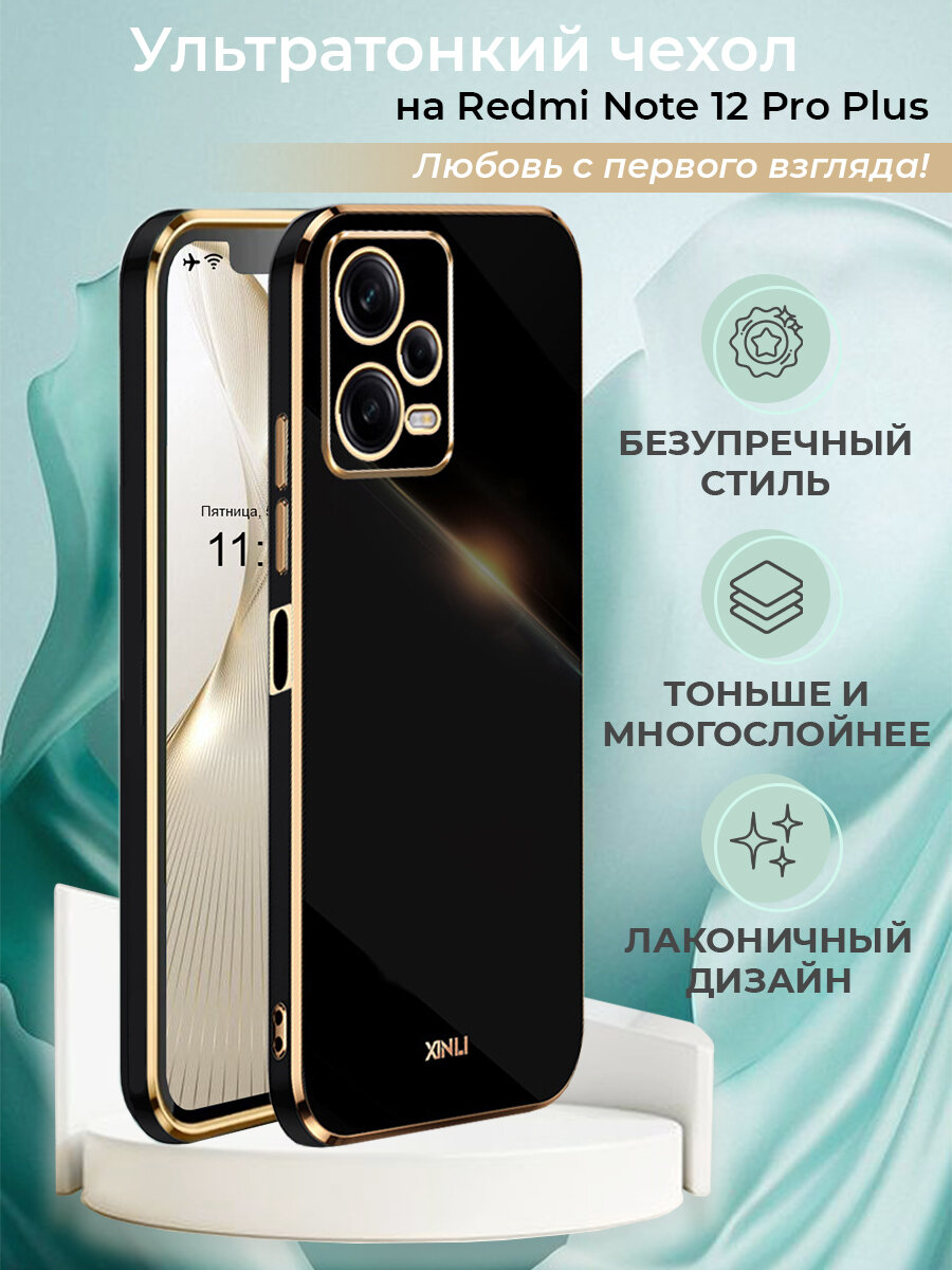 Отзывы на Чехол на Redmi Note 12 Pro Plus защитный силиконовый бампер на Редми Нот 12 Про Плюс с золотой рамкой Черный