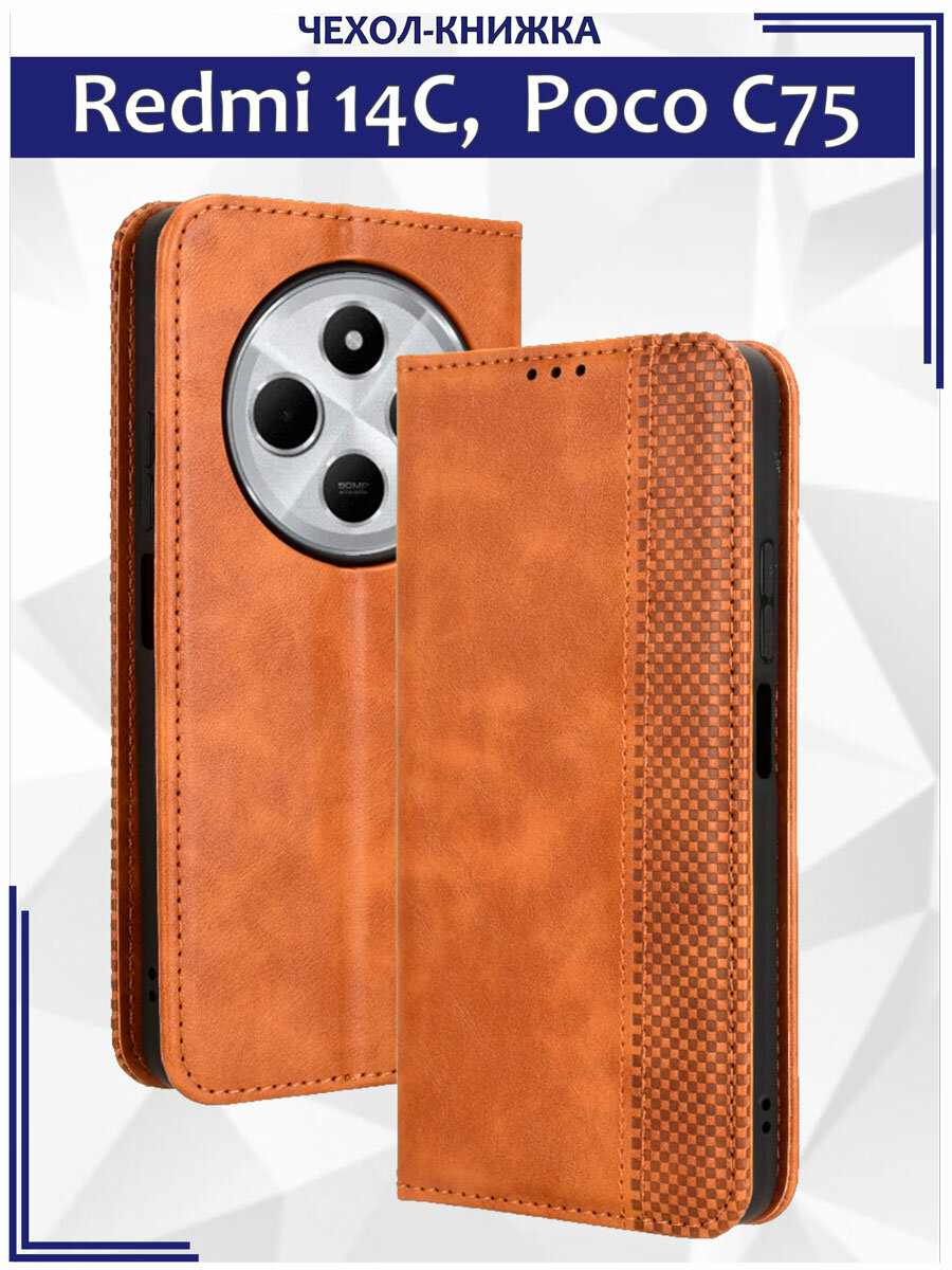Чехол книжка для Xiaomi Redmi 14C, Poco C75 (4G) с магнитом и отделением под карты / Редми 14С, Поко С75 (коричневая) информация: