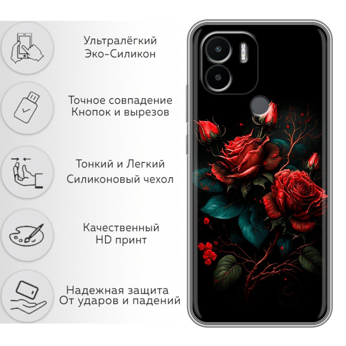 Отзывы на Чехол для Xiaomi Redmi A1+, Redmi A2+, Poco C51 с принтом Розы красные на Сяоми Редми А1+, Редми А2+, Поко С51