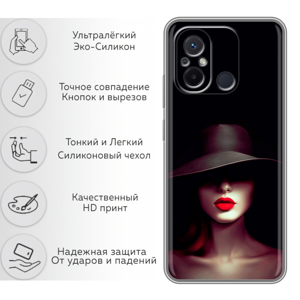 Отзывы на Чехол для Xiaomi RedMi 12C с принтом Девушка в шляпе на Сяоми Редми 12С