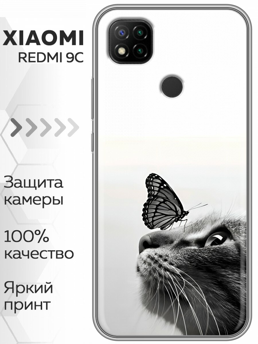 10 цен на Чехол для Xiaomi RedMi 9C с принтом кот и бабочка на Сяоми Редми 9С