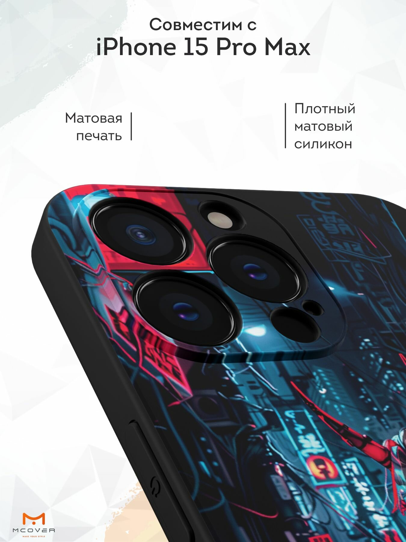 Чехол Mcover с рисунком Киберо Неко на iPhone 15 Pro Max, силиконовый, матовый, защита камеры 530 ₽