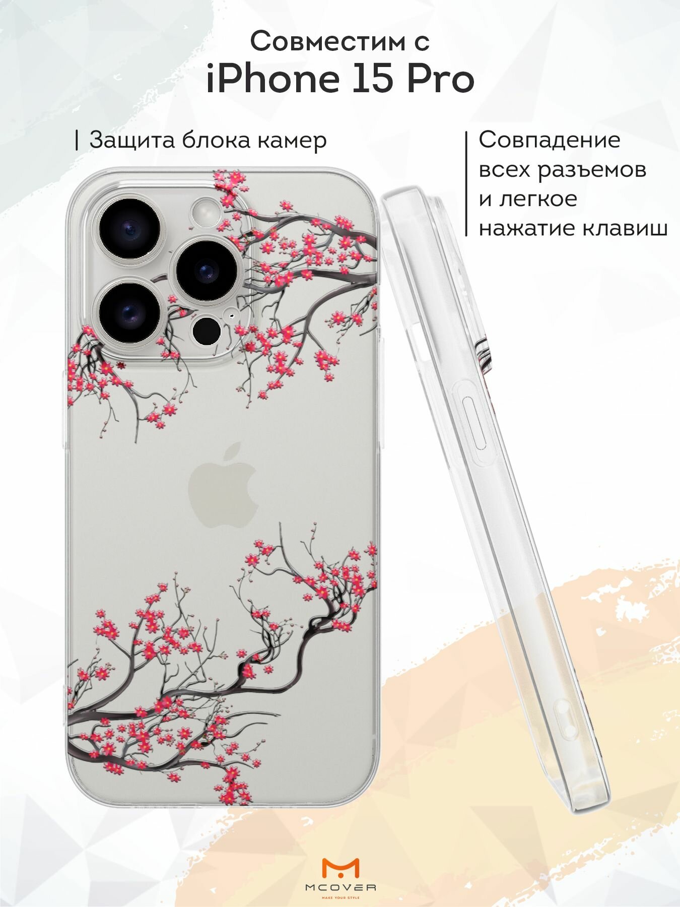 10 цен на Чехол Mcover с рисунком Сакура цветущая на iPhone 15 Pro, силикон, прозрачный, защита камеры