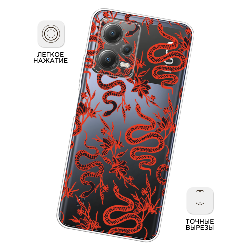 Чехол на Xiaomi Poco X5 5G / Сяоми Поко X5 5G с принтом Цветы и змеи красные 2, прозрачный информация:
