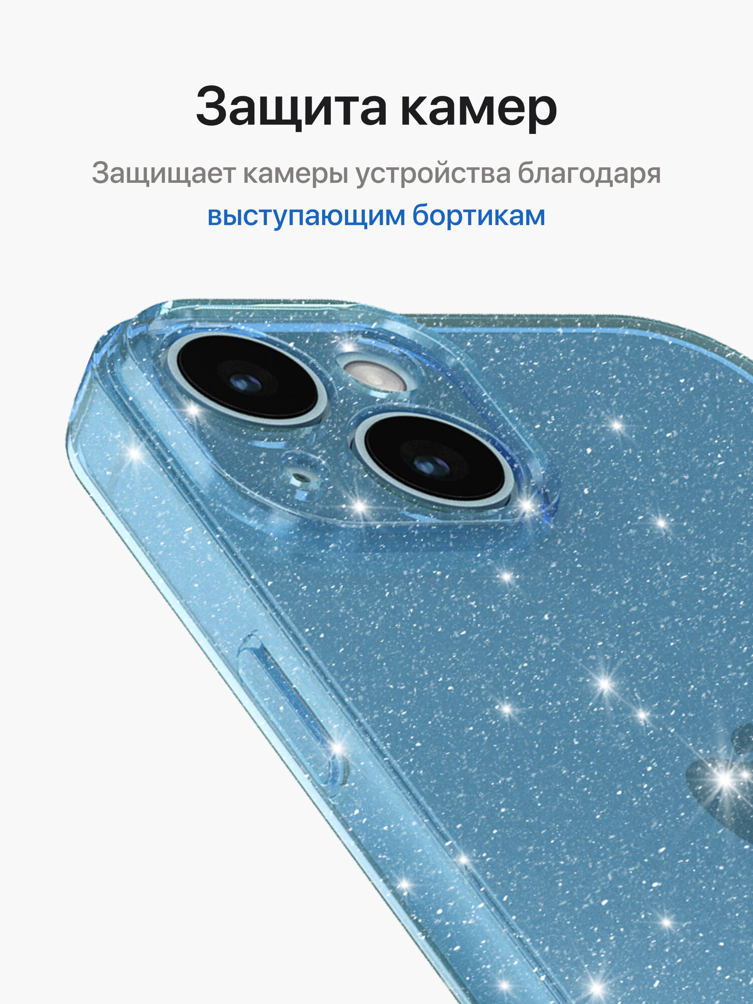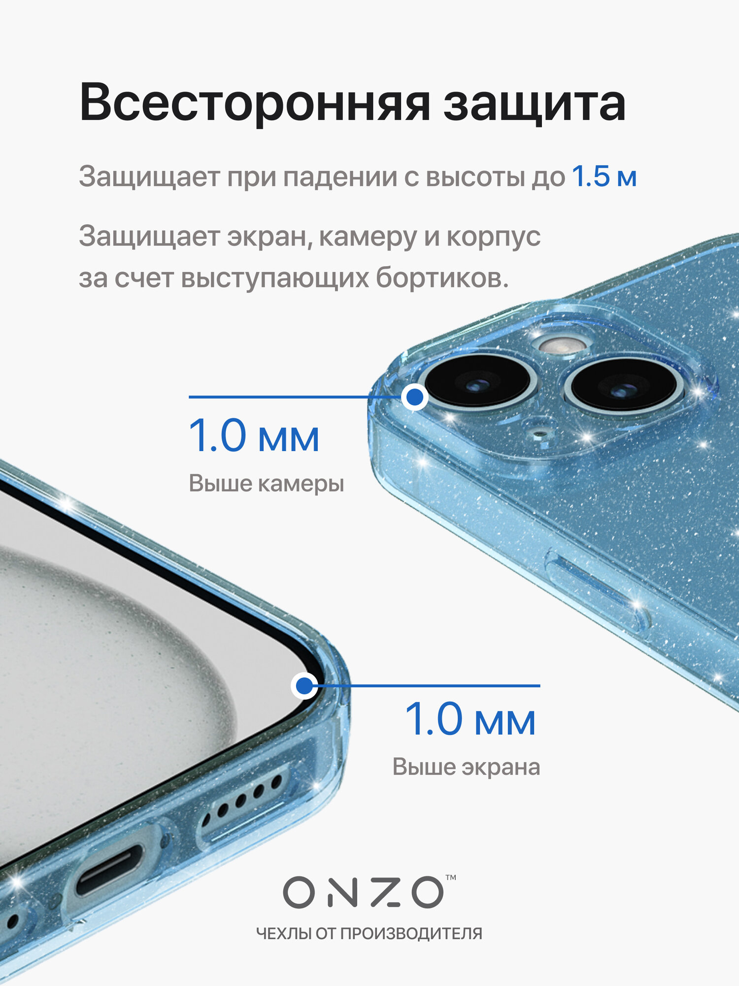 Отзывы на Чехол для iPhone 15 / Айфон 15 бампер накладка голубой прозрачный с серебряными блестками