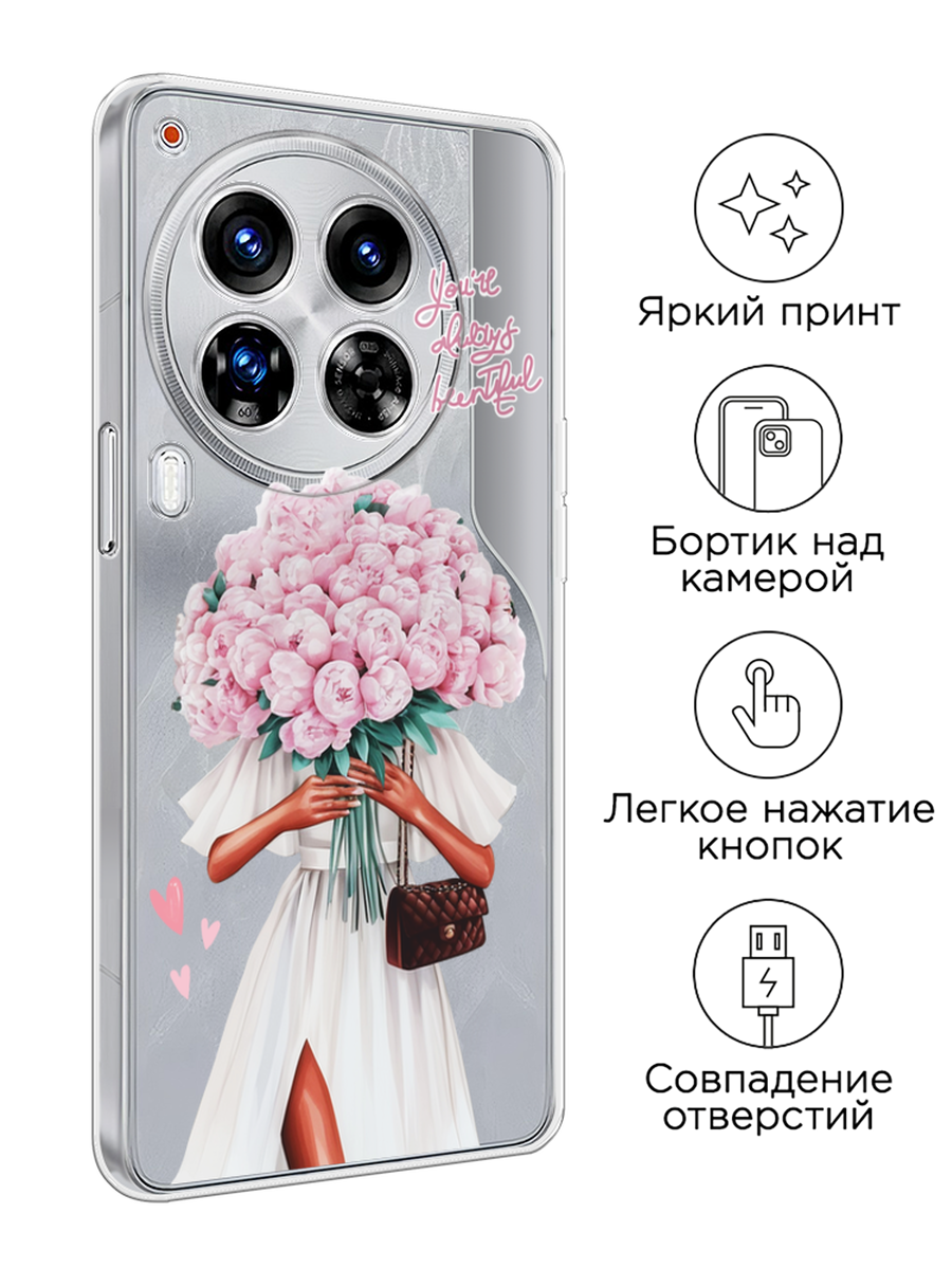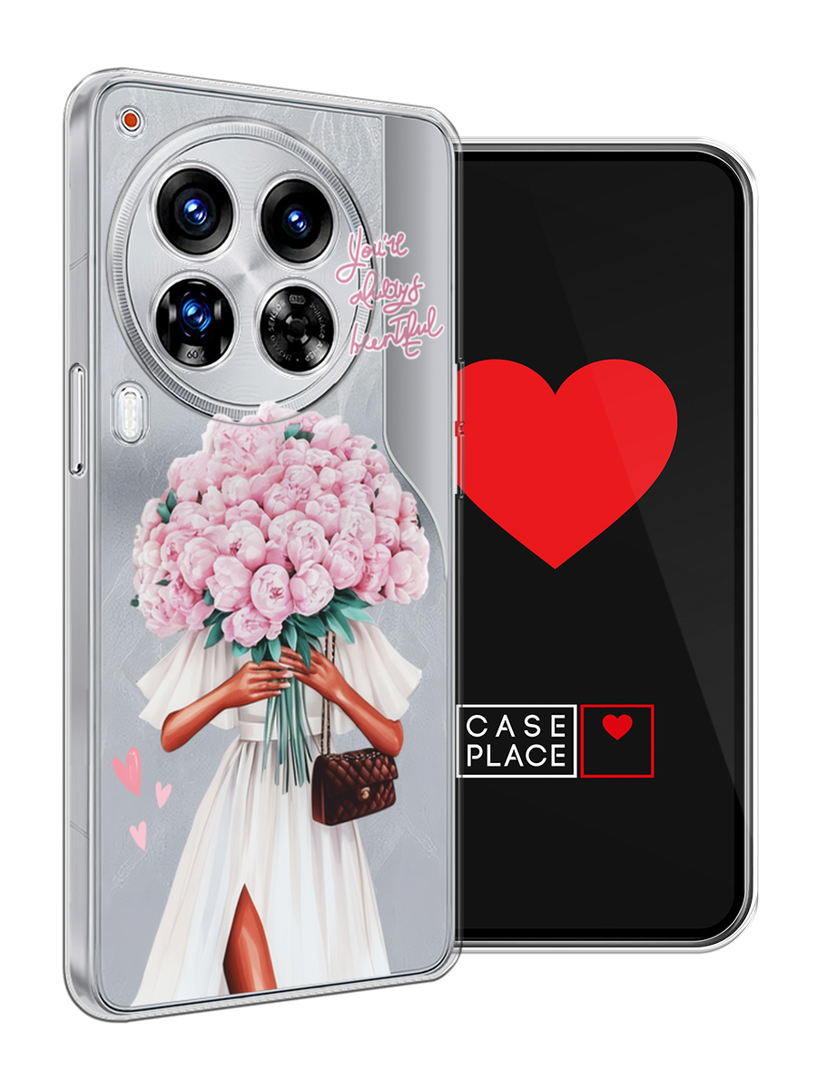 Отзывы на Чехол на Tecno Camon 30 Premier / Текно Камон 30 Премьер с принтом Девушка с букетом пионов, прозрачный