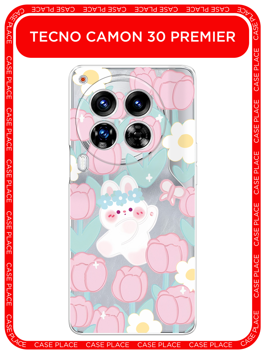 10 цен на Чехол на Tecno Camon 30 Premier / Текно Камон 30 Премьер с принтом Зайка в тюльпанах, прозрачный