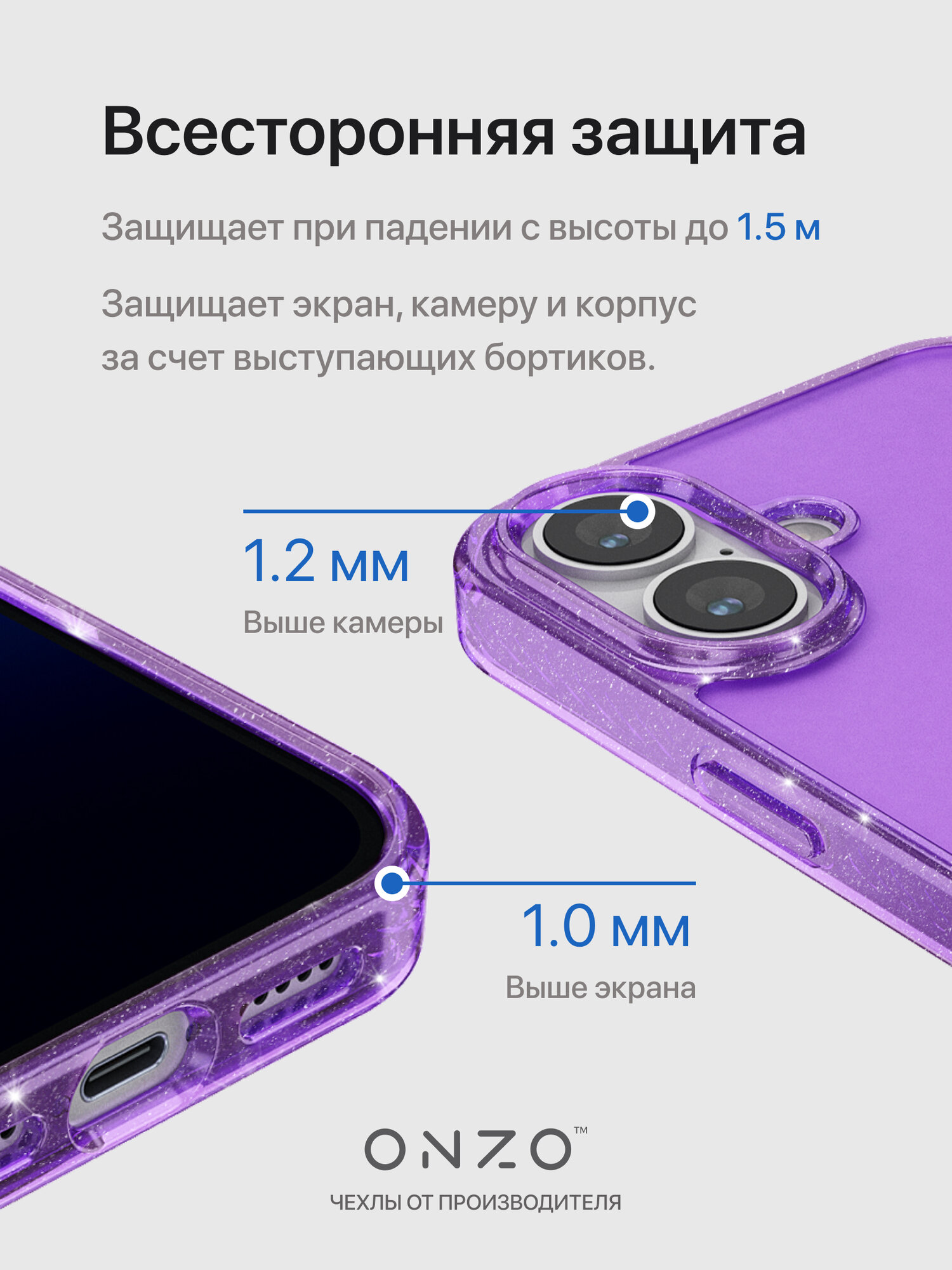 Отзывы на Матовый чехол на iPhone 16 / Айфон 16 с блестками по краям, прозрачный фиолетовый