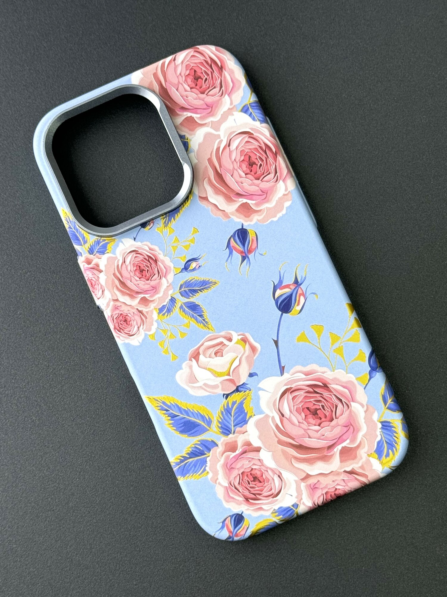 Отзывы на Чехол на IPhone 16 Pro Max с MAGSAFE из ударопрочного пластика с цветами и защитой камеры голубой