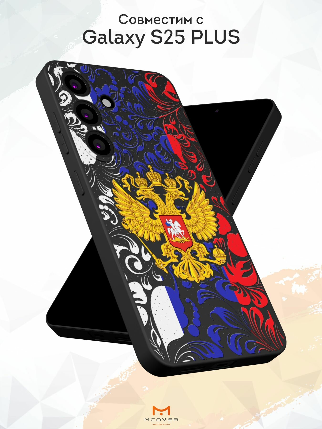 Силиконовый чехол Mcover, на Galaxy S25 Plus, с принтом Герб и орнамент, черный, защита камеры 530 ₽
