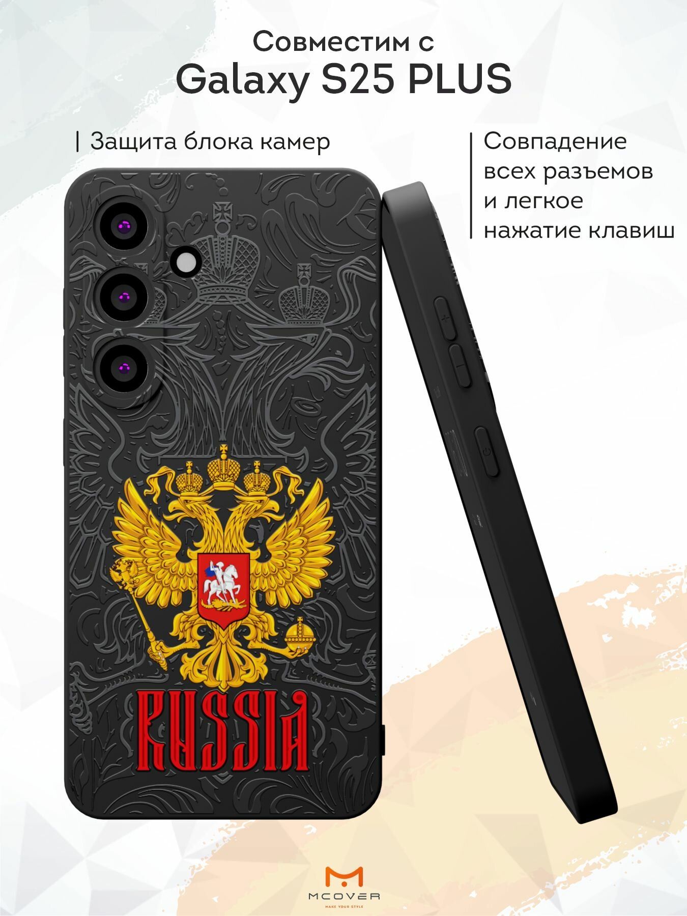 Силиконовый чехол Mcover, на Galaxy S25 Plus, с принтом Россия, черный, защита камеры информация: