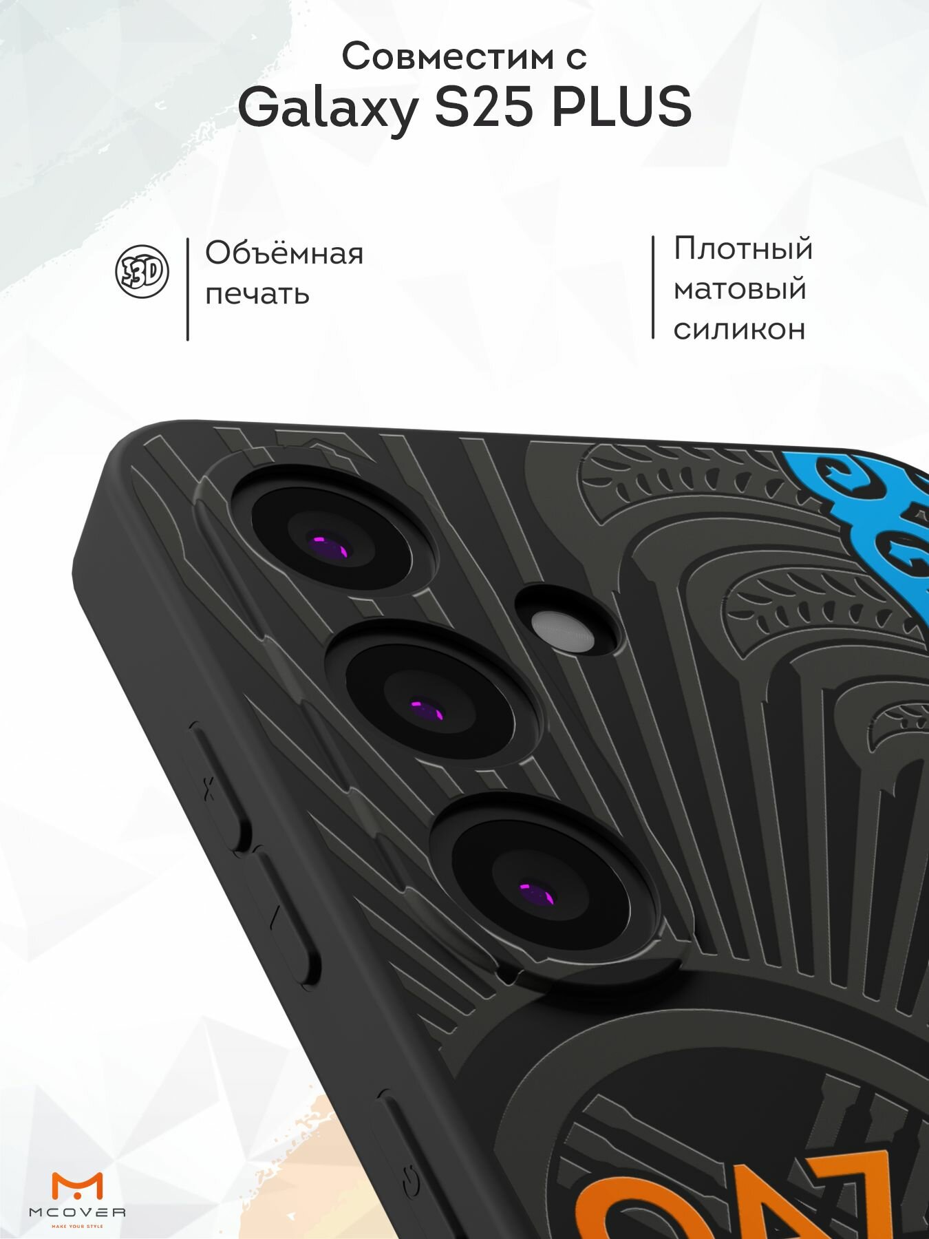 Силиконовый чехол Mcover, на Galaxy S25 Plus, с принтом Герб и орнамент, черный, защита камеры 530 ₽