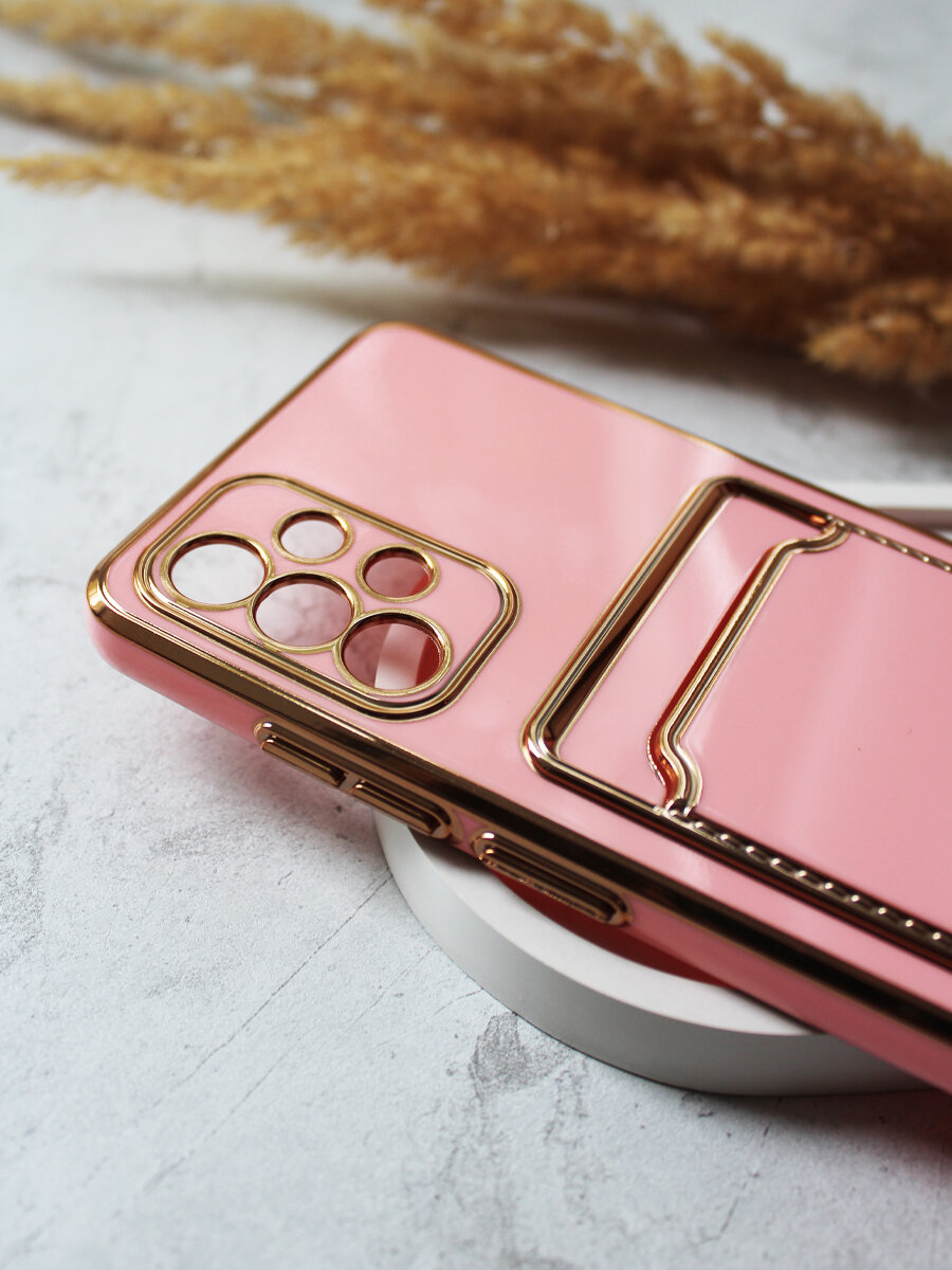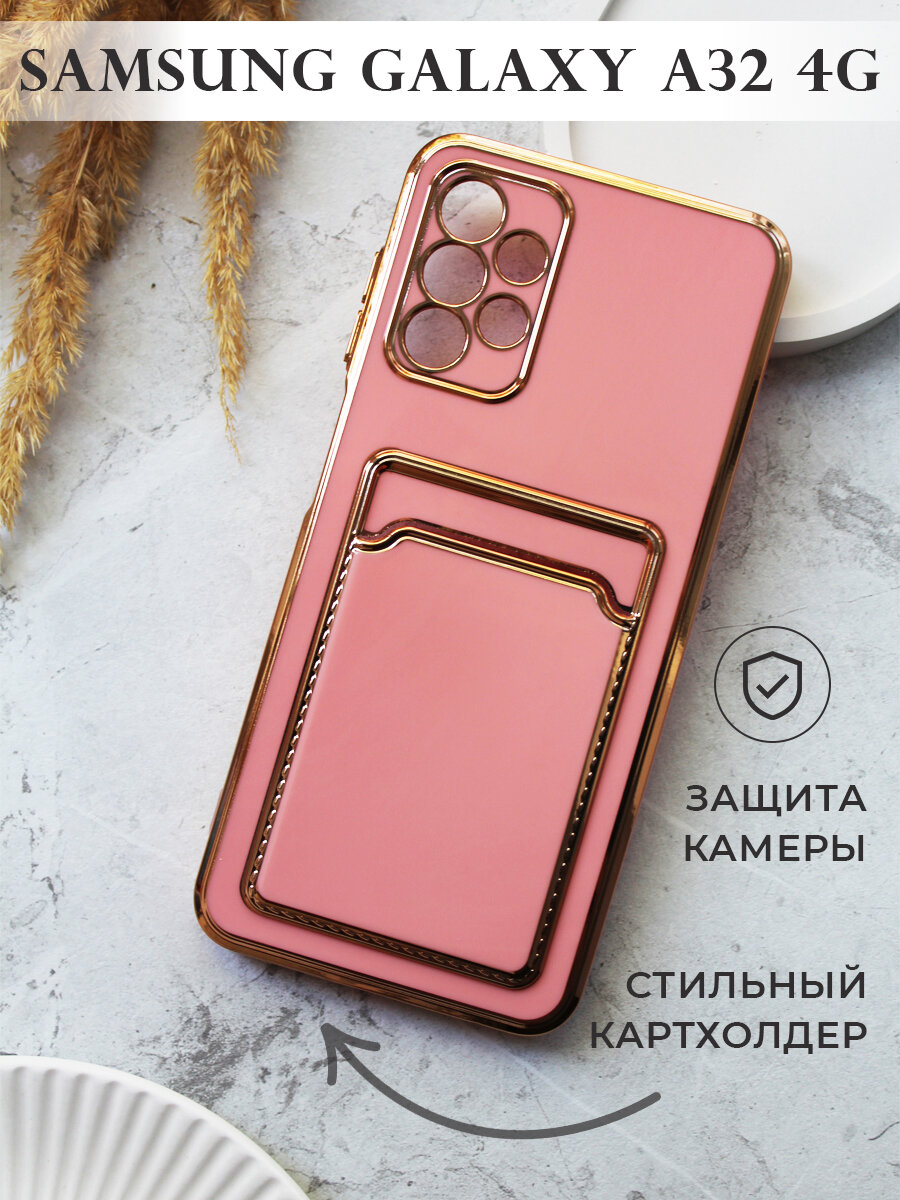 Чехол на Samsung Galaxy A32 с золотой рамкой противоударный бампер с карманом для карт для Самсунг гэлэкси А32 Розовый информация: