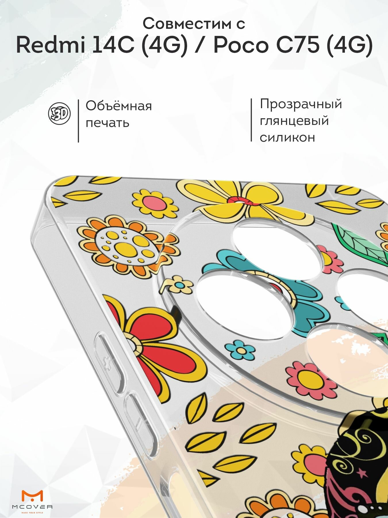 Силиконовый чехол Mcover на Redmi 14C (4G)/Poco C75 (4G), с принтом Кот в цветочном поле 530 ₽