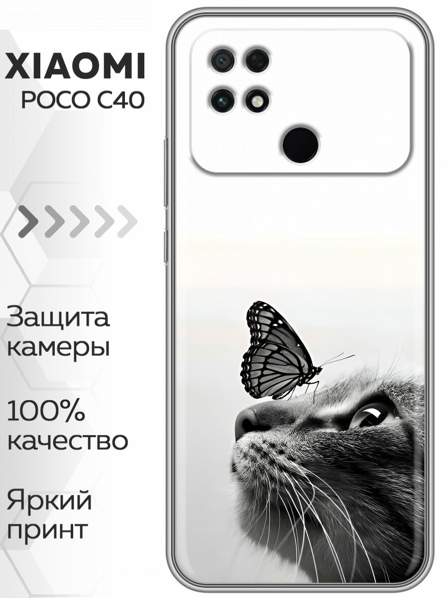 10 цен на Чехол для Xiaomi Poco C40 с принтом кот и бабочка на Сяоми Поко С40