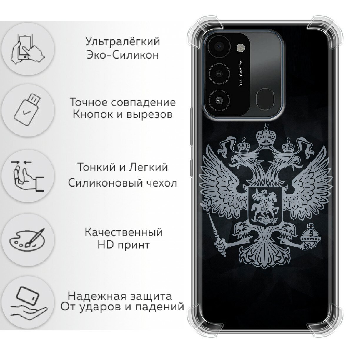 Отзывы на Чехол для tecno spark 8c, tecno spark go 2022 с принтом Герб России серый на Текно Спарк 8С, Техно Спарк Го 2022
